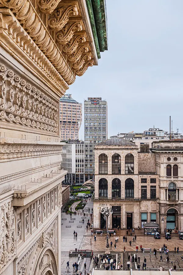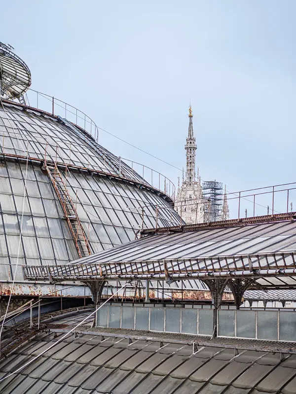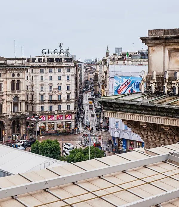 Vanaf de Sala degli Orologi ben je nog een trap verwijderd van de rooftop. Wat mij betreft het letterlijke hoogtepunt van het bezoek aan de Highline. Vanaf hier heb je een driehonderdzestig graden uitzicht over Milaan, met direct in beeld de indrukwekkende Duomo, het Piazza del Duomo en zicht op de Corso Italia.