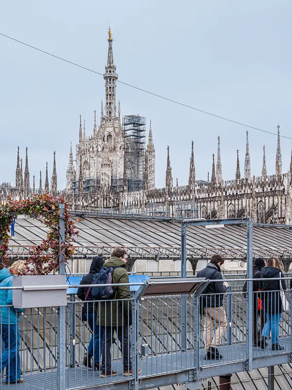Daarnaast kijk je uit over de skyline van Milaan, met in de verte de torens bij Porta Garibaldi (noord) en CityLife (west), San Siro en met een beetje geluk aan de horizon de Alpen en de Apennijnen. Een mooie kans om de omvang en diversiteit van Milaan te overzien!