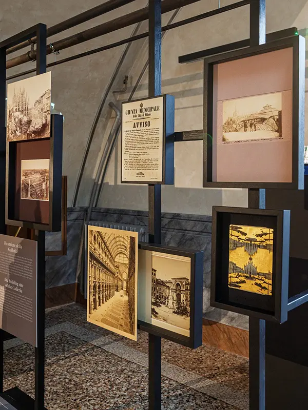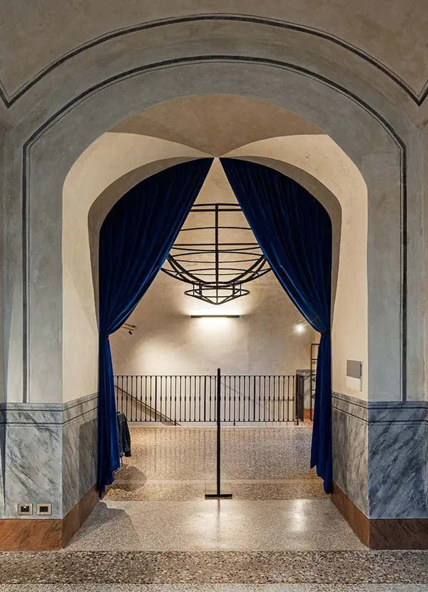 De ruimte, boven in de hoofdingang van de Galleria Vittorio Emanuele II, is voor het eerst open voor het publiek. Je komt binnen onder de permanente installatie van Alessandro Acquaviva. Hij maakte een stalen schaalmodel van de koepel van de winkelgalerij die op zijn kop in de entree is gehangen.