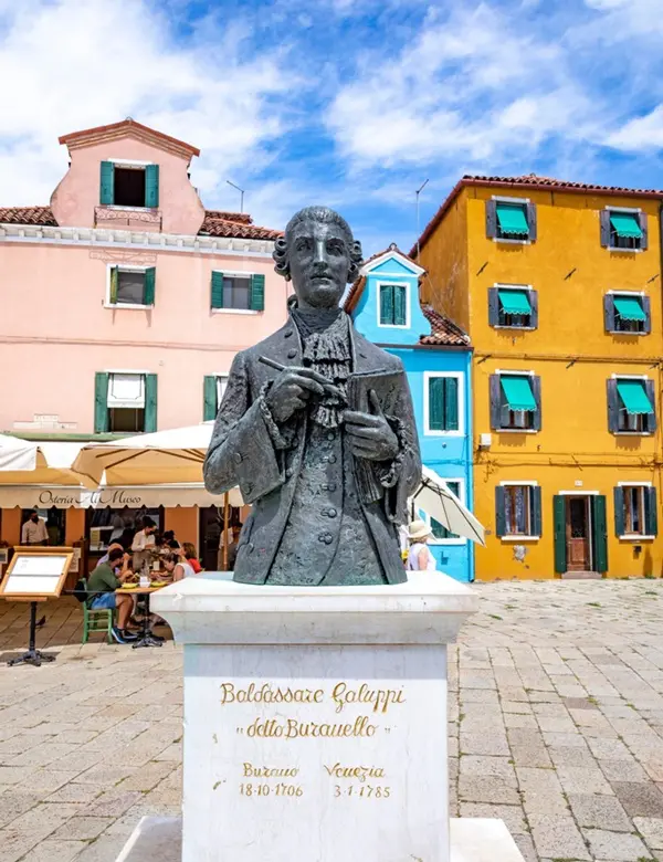 Vivaldi is niet de enige componist die je in Venetië tegen komt. Op Burano prijkt een standbeeld van Baldassare Galuppi, ook wel Il Buranello genoemd. Hij was componist en dirigent, die behalve in Venetië ook in Londen en Sint-Petersburg werkte. Hij schreef honderdtwaalf opera’s, onder meer libretti van Carlo Goldoni.