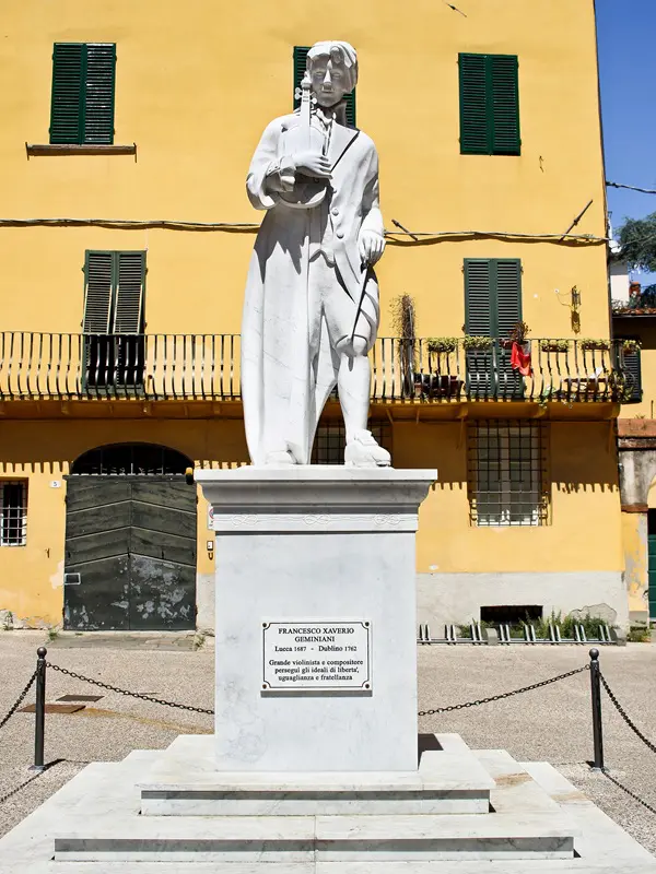 Vioolvirtuoos en componist Francesco Xaverio Geminiani (1687-1762) is vereeuwigd in zijn geboorteplaats Lucca, op het Piazza Guidiccioni. Hij heeft een strijkstok en een viool in zijn handen, de instrumenten die zijn leven veranderden.