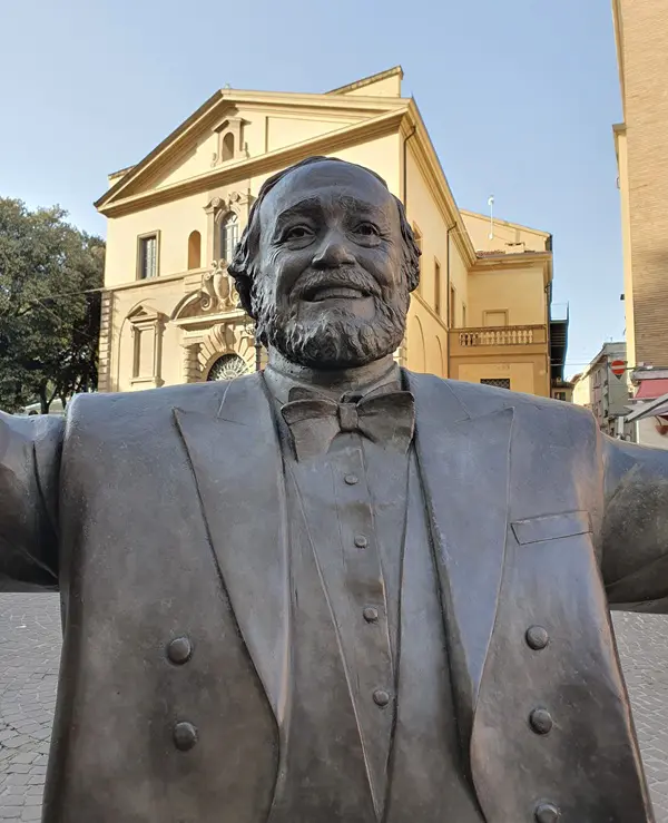 Aan hetzelfde plein als waar het standbeeld van Pavarotti staat, ligt het Teatro Rossini, dat in 1818 werd ingehuldigd met een uitvoering van de opera La Gazza Ladra, van de toen zesentwintigjarige componist Rossini.