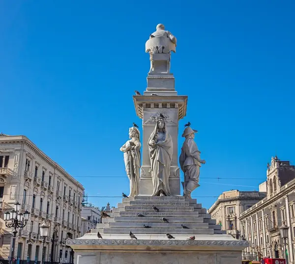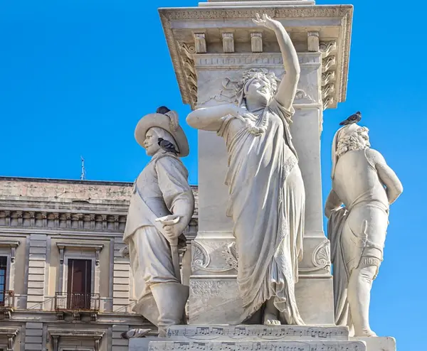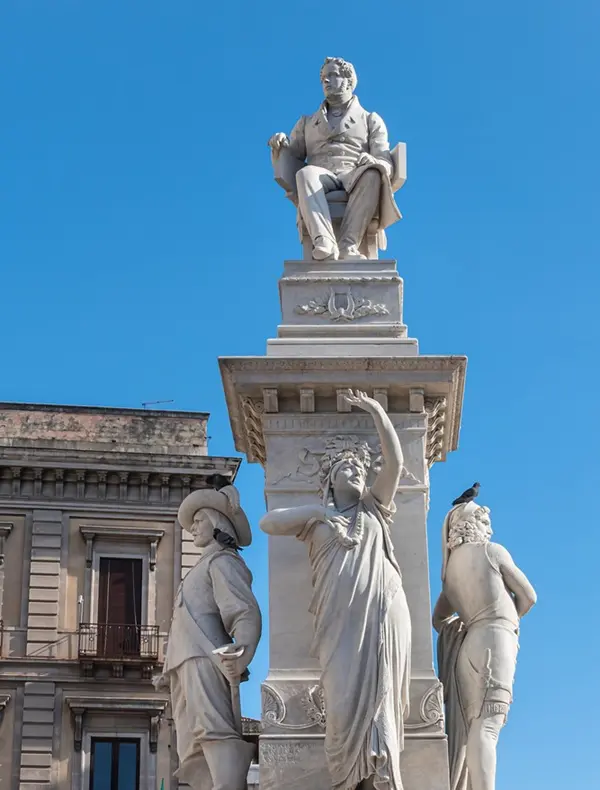 Sommigen wilden het graag voor het Teatro Massimo Bellini plaatsen, dat toen nog in aanbouw was, anderen zagen het liever midden op het Piazza Duomo. Uiteindelijk werd het Piazza Stesicoro het thuis van Bellini’s beeld, met een sokkel die precies zeven treden kreeg, als verwijzing naar de zeven muzieknoten. Aan zijn voeten herken je zijn vier beroemdste werken: Norma, I Puritani, La Sonnambula en Il Pirata.