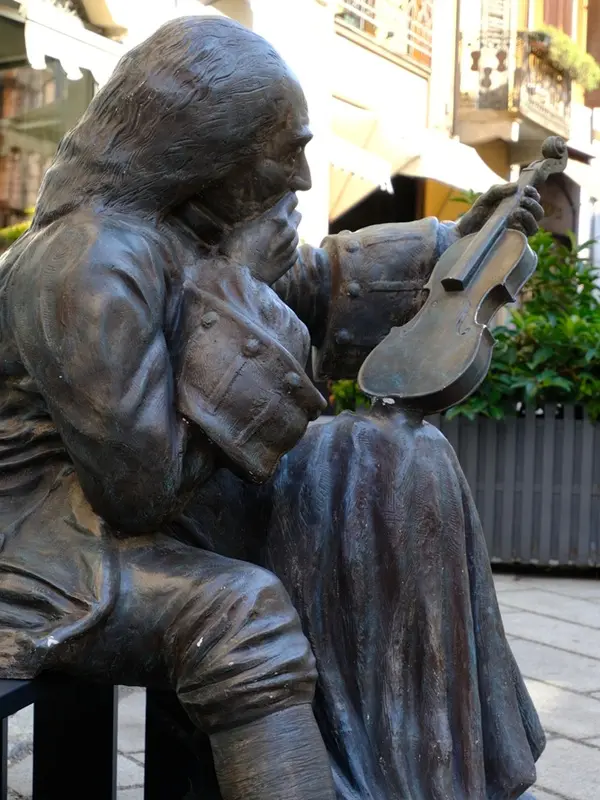 Wie Venetië zegt, denkt op muzikaal vlak natuurlijk ook meteen aan Antonio Vivaldi. Toch moet je in de stad even zoeken naar een beeld dat aan hem herinnert.