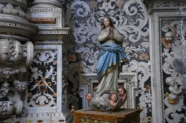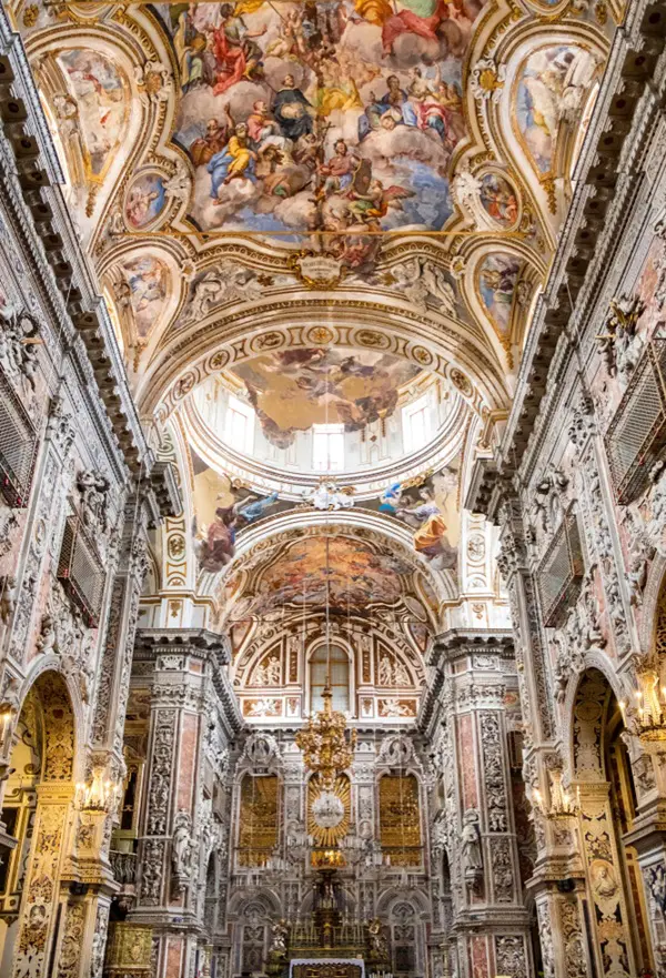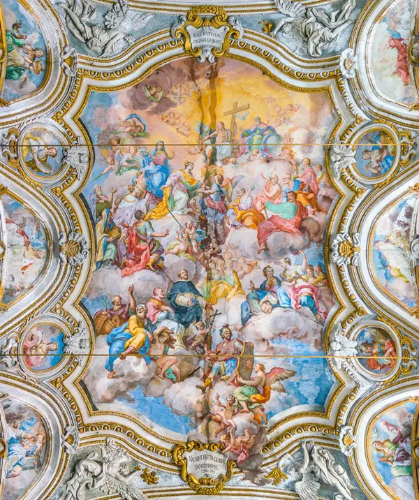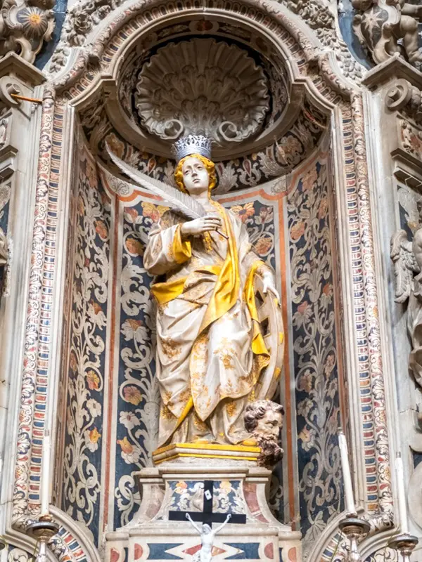 Op het plafond schittert een fresco met de triomf van de heilige Catharina. Ook het indrukwekkendste zij-altaar van de kerk is aan deze heilige gewijd. Je ziet haar afgebeeld met martelaarskroon en palmtak. Naast haar staat het rad waarop ze werd gemarteld.