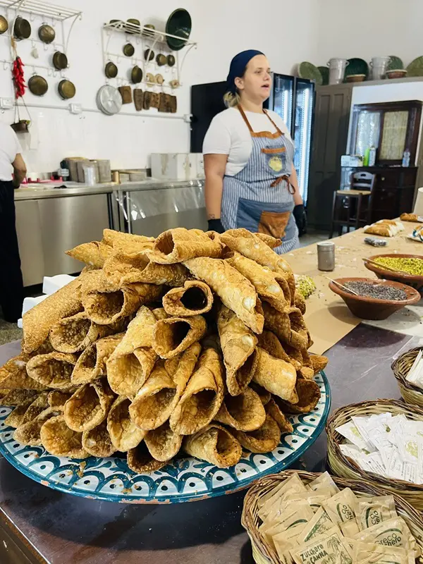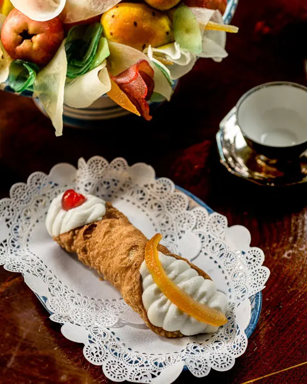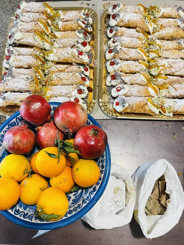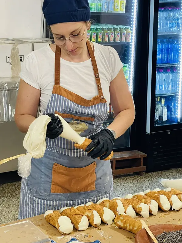 Als vanzelf word je aandacht getrokken door de grote manden op de werkbank vol lege, nog niet gevulde cannoli, zodat ze goed knapperig blijven. De cannoli worden ter plekke gevuld met roomzachte ricotta, afkomstig van schapen uit de omgeving van Palermo.