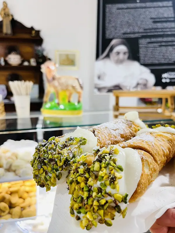 Allemaal lekker, maar de meeste klanten komen voor de beroemde, vers gevulde cannoli. We laten je graag alvast virtueel proeven van de cannoli en andere zoete geheimen van dit klooster. Buon appetito!