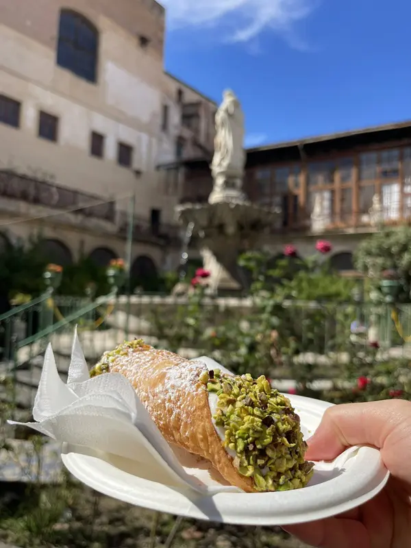 Als je je lekkernijen hebt afgerekend, kun je een plekje zoeken in de besloten kloostertuin om te smullen van de hemelse Siciliaanse kunstwerkjes. Een schitterende setting om een verse cannolo te eten, die nog lekkerder smaakt als je de geschiedenis van de kloosterbakkerijen in Palermo kent.