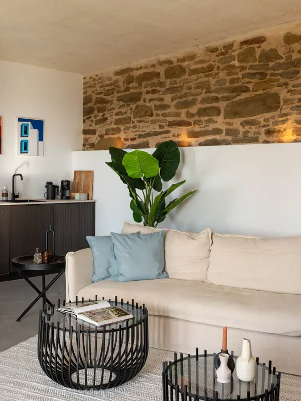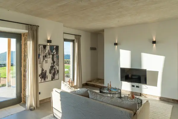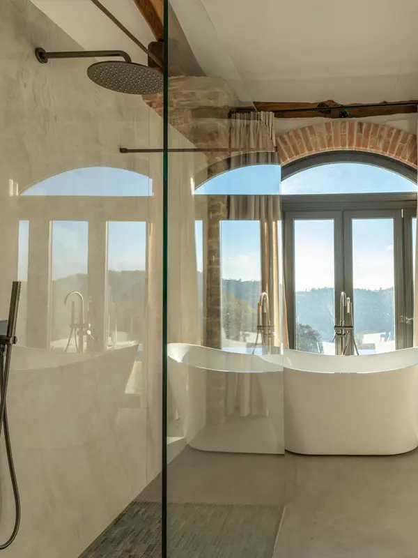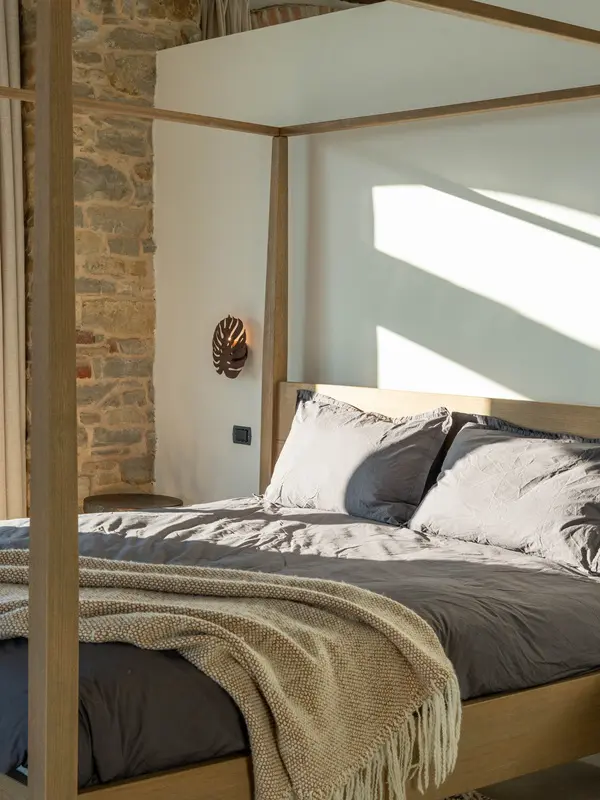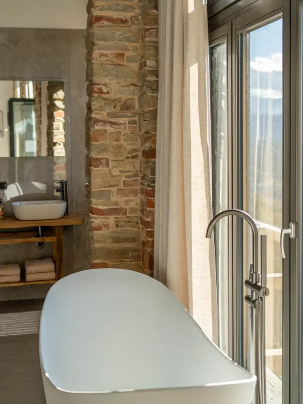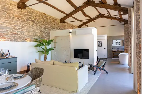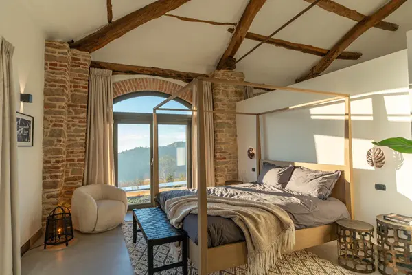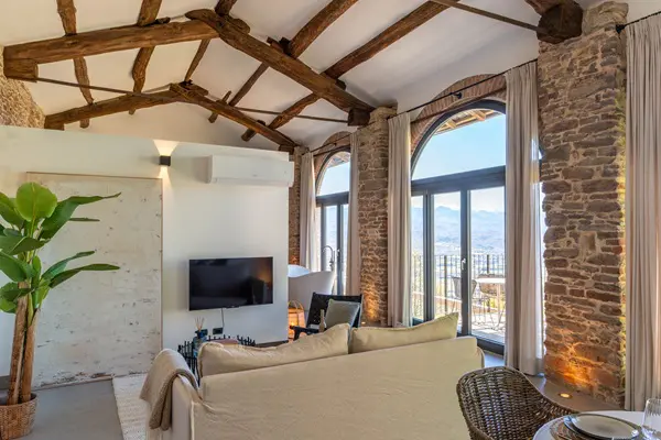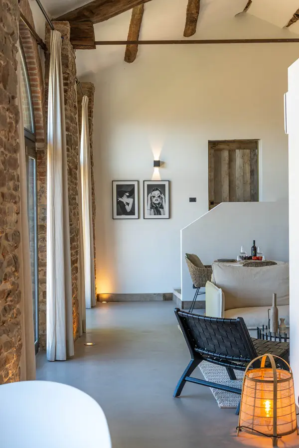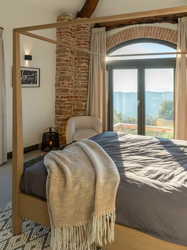 Ook in de appartementen zelf valt veel moois te zien, van de authentieke boogramen tot de muren in pietra delle Langhe. De open loftstructuur geeft een ruimtelijk effect, dat versterkt wordt door het gebruik van natuurlijke kleuren en materialen, ook voor het luxe bed- en badlinnen.