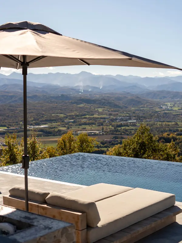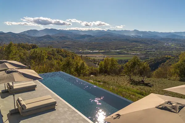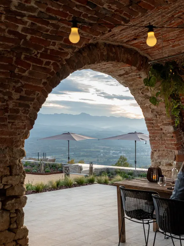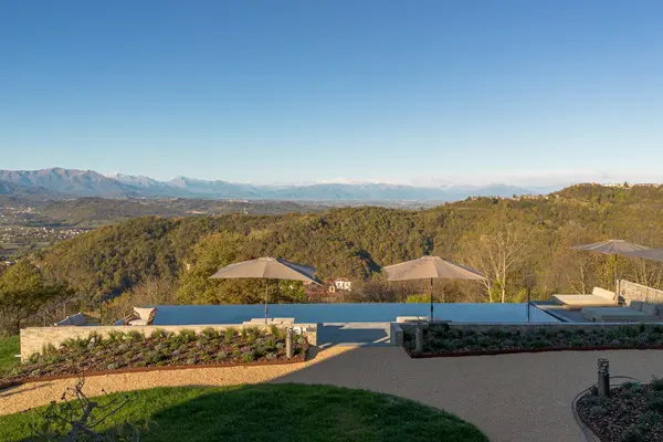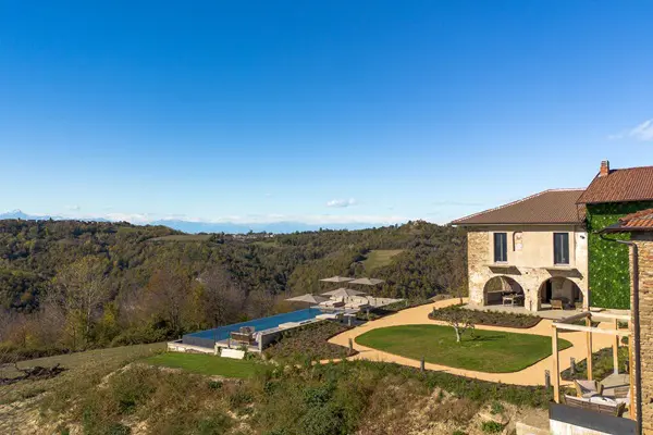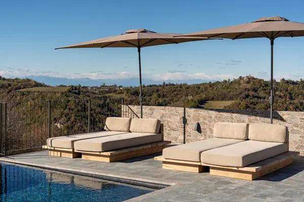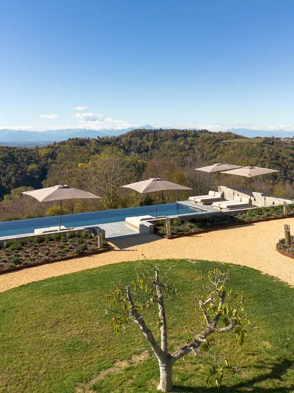 Buiten wacht een infinity pool met luxe tweepersoonsligbedden, waar het na een verfrissende duik heerlijk relaxen is. Je kijkt uit over het zuidwesten over het dal, richting de Alpen, met als letterlijk en figuurlijk hoogtepunt de Monviso. Dit uitzicht is elk seizoen weer anders en verveelt nooit.