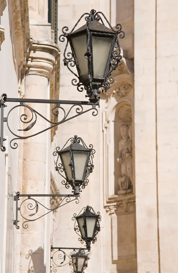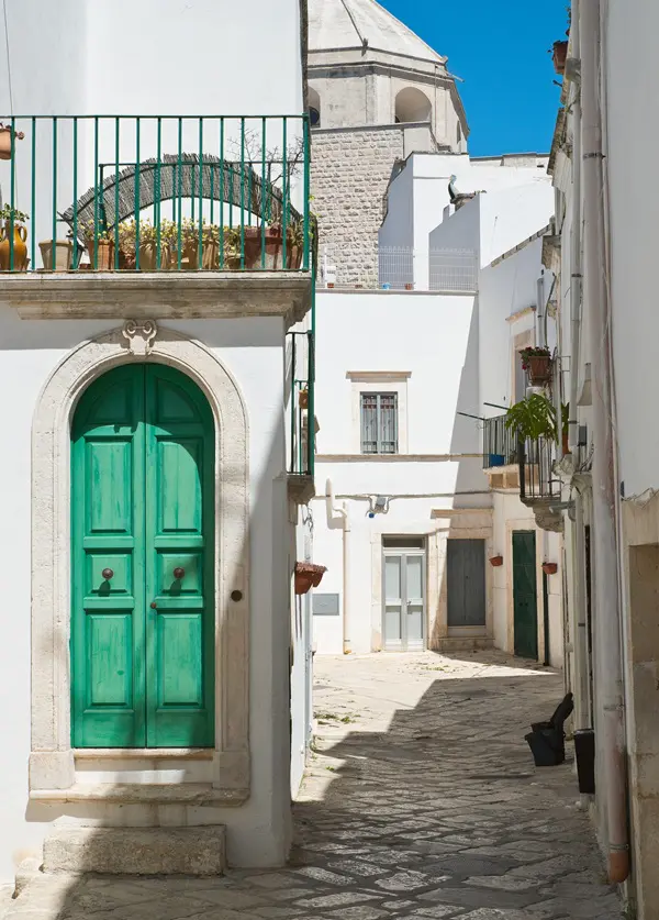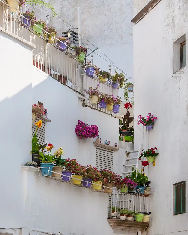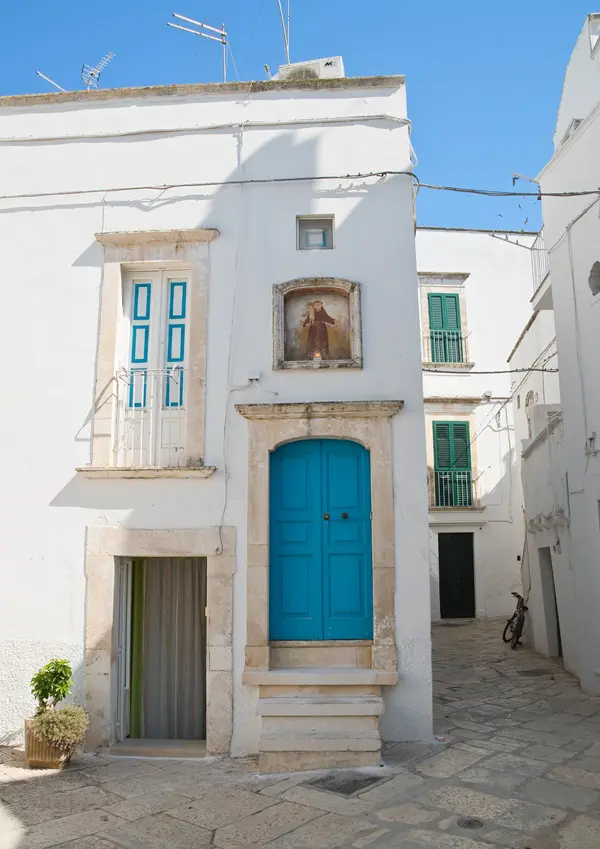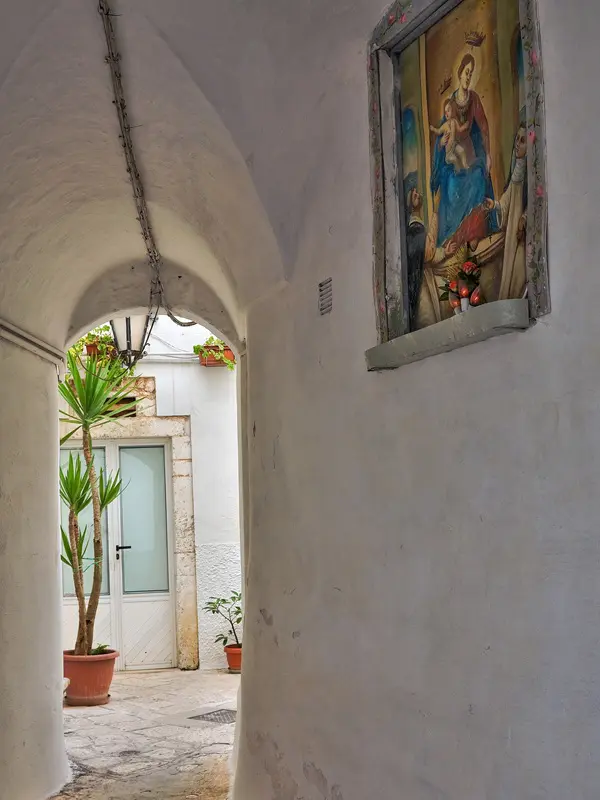 In de straatjes van Martina Franca kom je het een na het andere pittoreske hoekje tegen, met hagelwitte huizen met kleurrijke deuren, uitbundige bloempotten, wapperende was, Maria-altaartjes, gietijzeren lantaarns, elegante balkons en sierlijk stucwerk.