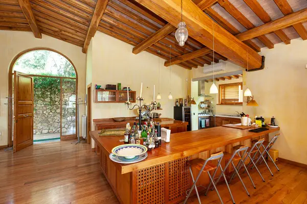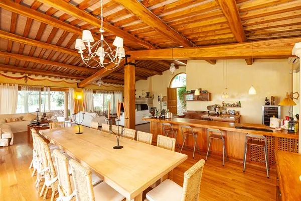 In de villa kun je ontspannen in de ruime woonkamer met banken en een openhaard, met op dezelfde verdieping een eetkamer, een grote keuken en een toilet. Buiten eten kan natuurlijk ook, want ook op het grote terras staan een eethoek en comfortabele banken.