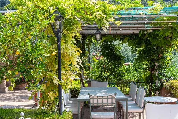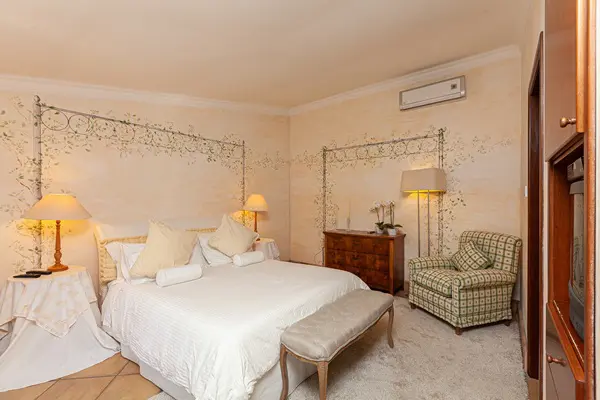 De door grote bomen omzoomde laan leidt naar de villa, die wordt omring door een prachtige tuin met zwembad en genoeg plekken om in de zon of schaduw te genieten van een goed boek of gewoon even helemaal niks.