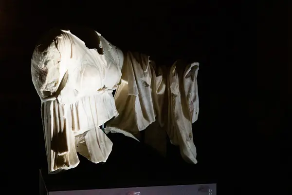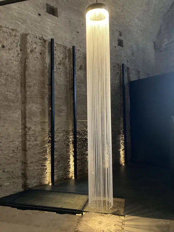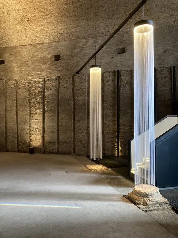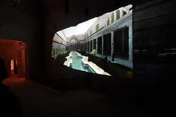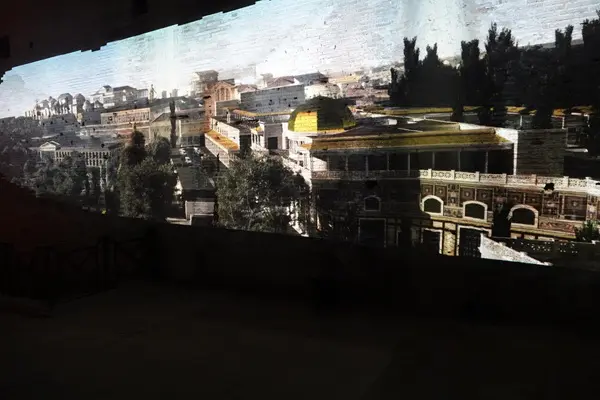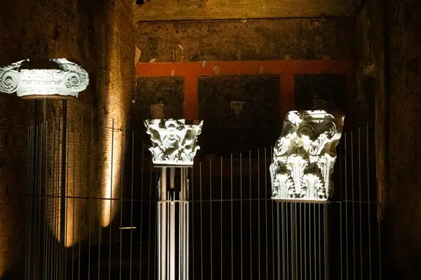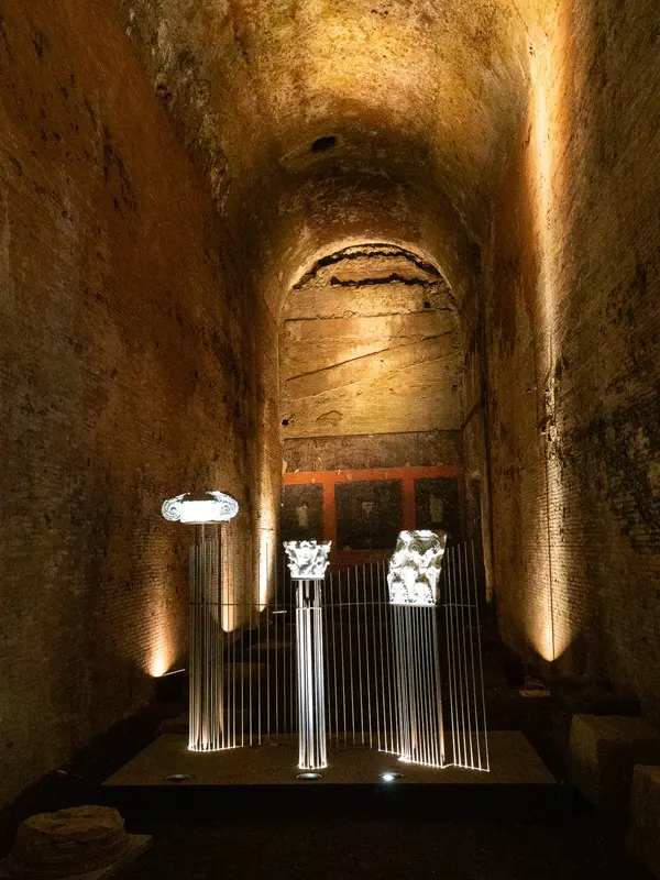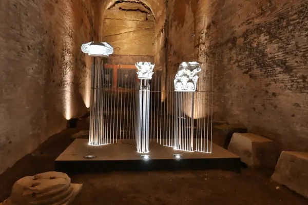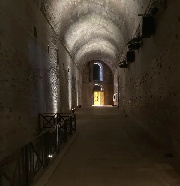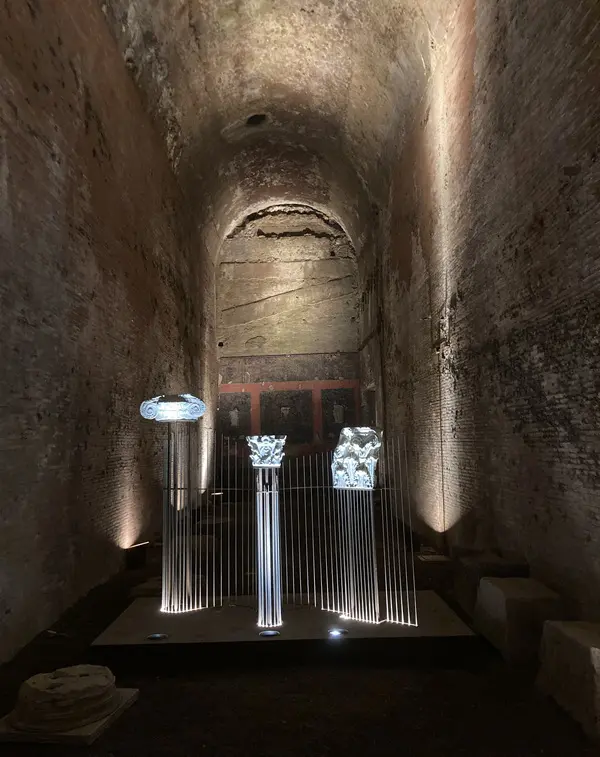 Als je na het filmpje buitenom naar een andere ingang loopt, is een deel van de zuilengalerij die aan de buitenkant van Nero’s paleis lag, knap nagemaakt met licht.