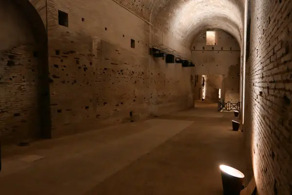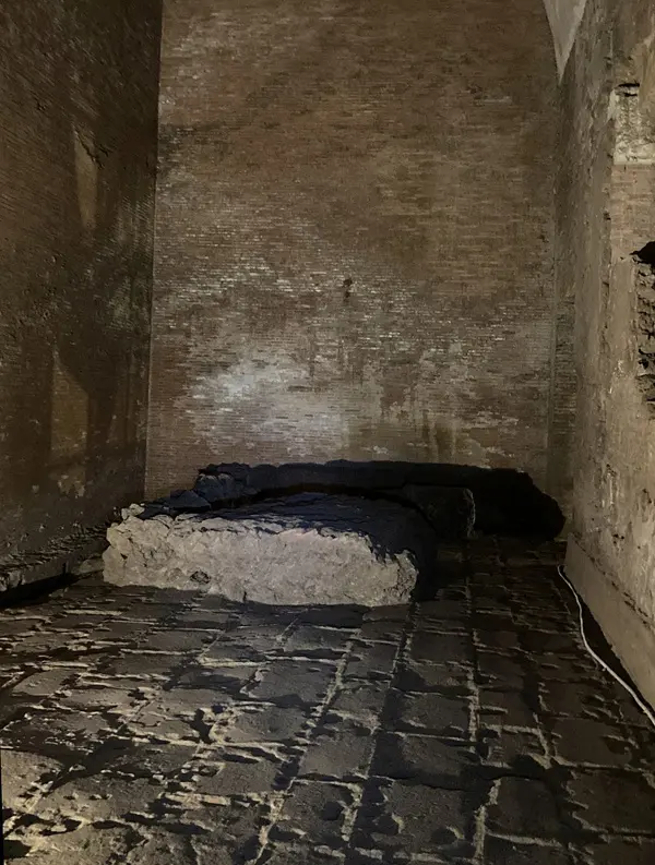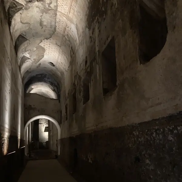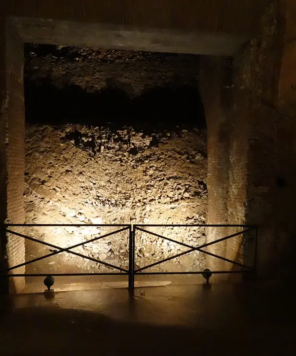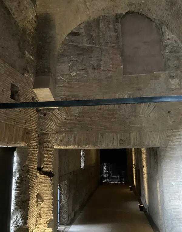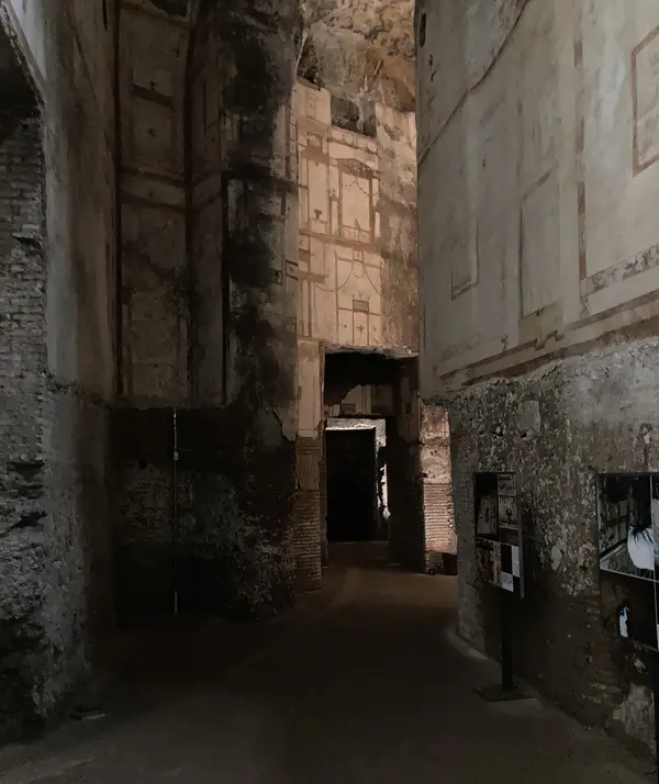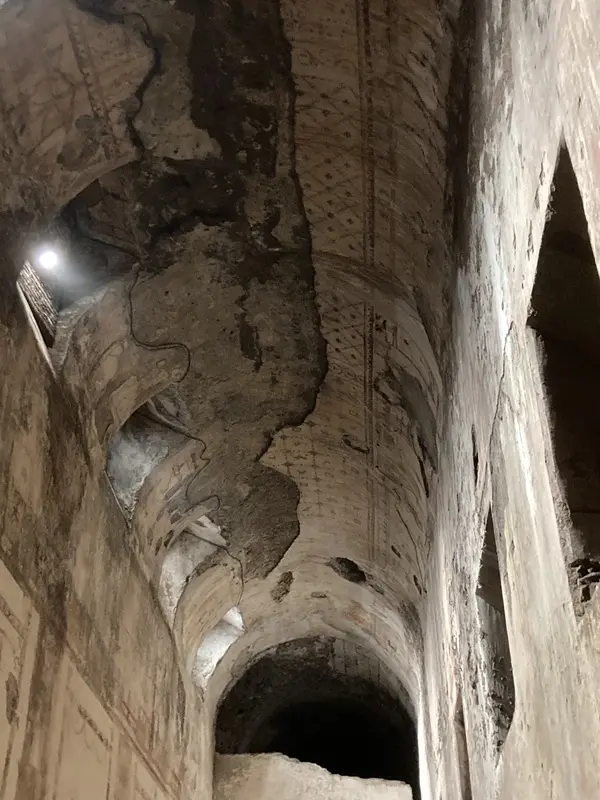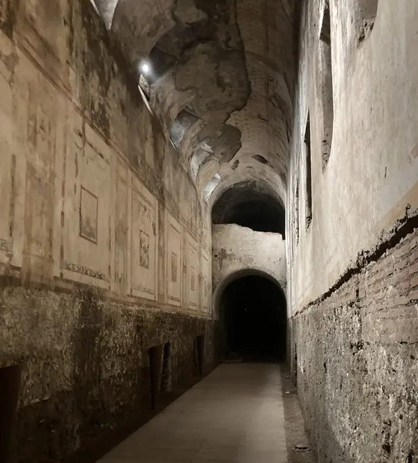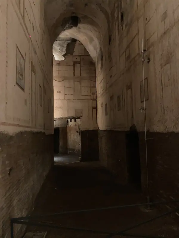 Daarna sta je in een vrij kale stenen gang, de westelijke vleugel van het paleis. Het is hier moeilijk voor te stellen dat de Domus Aurea ooit een gigantisch complex was, groter dan het Vaticaan nu is.