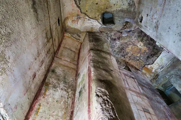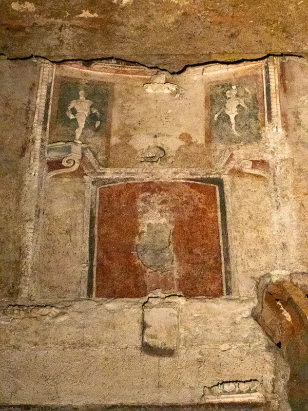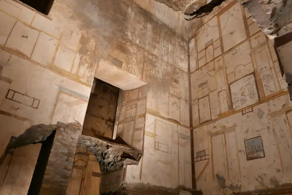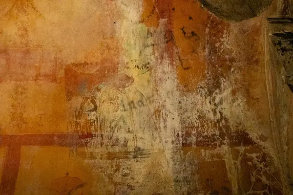 Sommige zalen zijn van puin ontdaan en verder leeg gelaten. Hier en daar zijn al wat gehavende fresco’s zichtbaar.