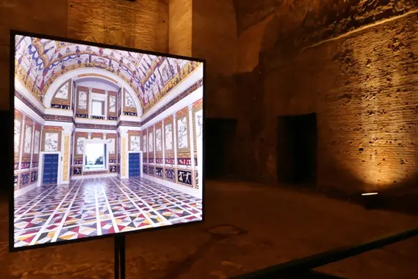 Met façades en muren vol bladgoud, edelstenen en fresco’s. Zalen waar, zoals Suetonius optekende, reukwater en bloemblaadjes over de gasten werden uitgestrooid. Bij het hoofdgebouw hoorden bossen, landerijen en suggestieve waterpartijen. Als start van je bezoek laat een film zien hoe het vroeger moet zijn geweest.