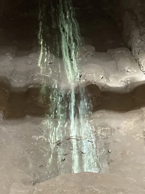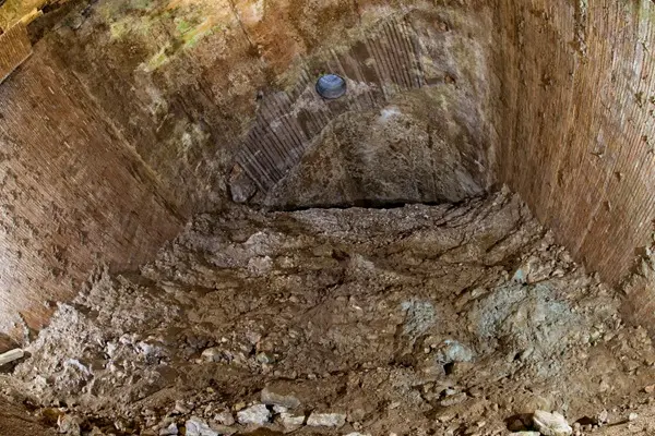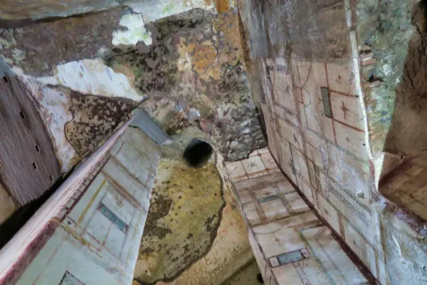 Als je verder het gebouw inloopt zie je op een paar plaatsen de gaten in de plafonds waar mensen vroeger door naar binnen kwamen. Hoog op de muren zitten gaten waardoor mensen zich een weg zochten naar andere zalen.