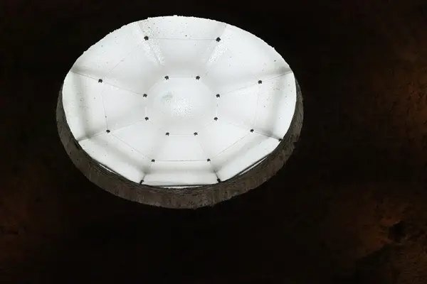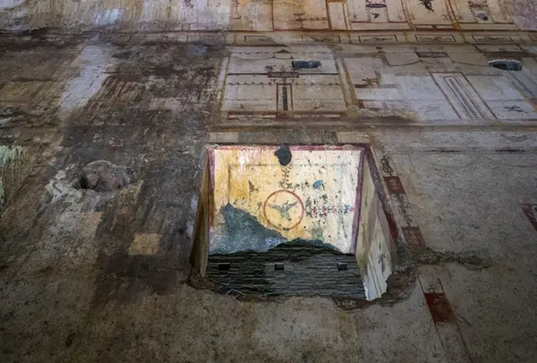 Gaten in de wand van de koepel laten zien waar marmeren platen zaten. Volgens een ingenieus systeem konden deze platen ronddraaien. Nero zag zichzelf immers graag als de zonnegod, de keizer om wie alles draaide. In een hoek is met licht de illusie van de fontein herschapen die daar zat.