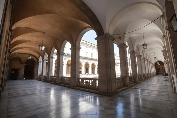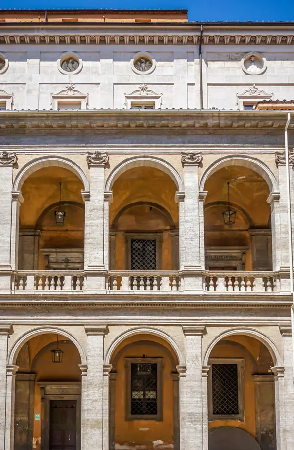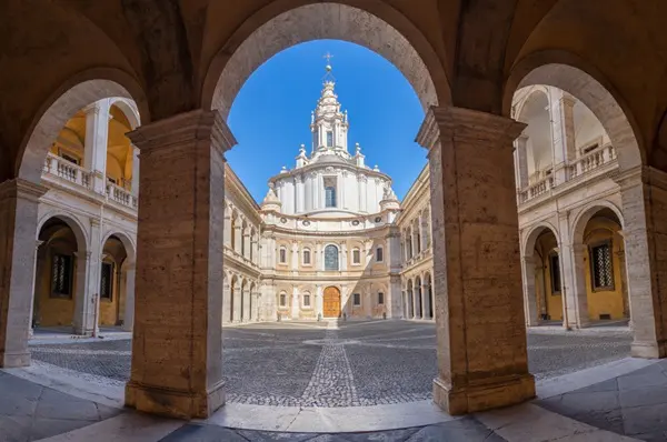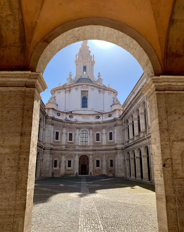 Als je Borromini’s werk beter wil bekijken, kun je de binnenplaats van het Palazzo della Sapienza op wandelen. De kerk prijkt aan het ‘hoofd’ van een elegante zuilengalerij, waarin het Archivio di Stato, het staatsarchief huist.