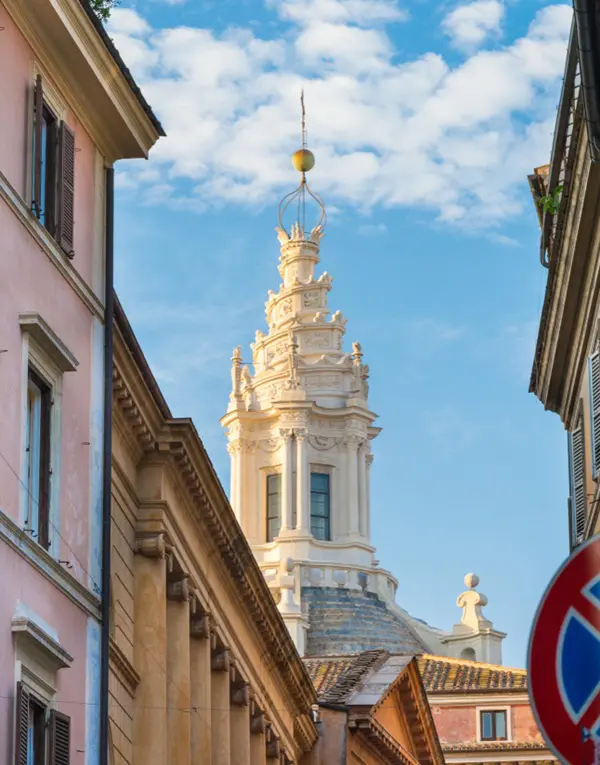 Je kijkt vanaf het terras namelijk uit op het wervelende torentje van de kerk Sant’Ivo alla Sapienza, dat wel wat weg heeft van een bruidstaart.