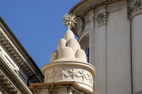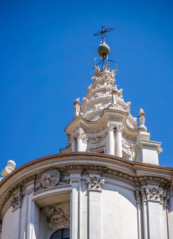 Sommige wetenschappers zagen er eerder een grote bij in, het symbool van de Barberini’s. Er zijn natuurlijk sowieso genoeg verwijzingen naar pausen, met name naar Alexander VII Chigi, die Borromini na de dood van Urbanus VIII door liet werken aan de kerk en wiens familiewapen – zes bergjes met daarboven een ster – vaak te zien is in en om de Sant’Ivo alla Sapienza.