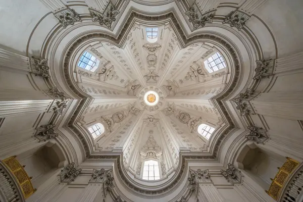 Het interieur van de kerk is grotendeels wit. Daardoor wordt je blik als vanzelf omhoog geleid, naar het gewelf dat bijna vloeiend lijkt, ook met dank aan het licht dat door de ramen en de openingen in de lantaarn naar binnen schijnt.