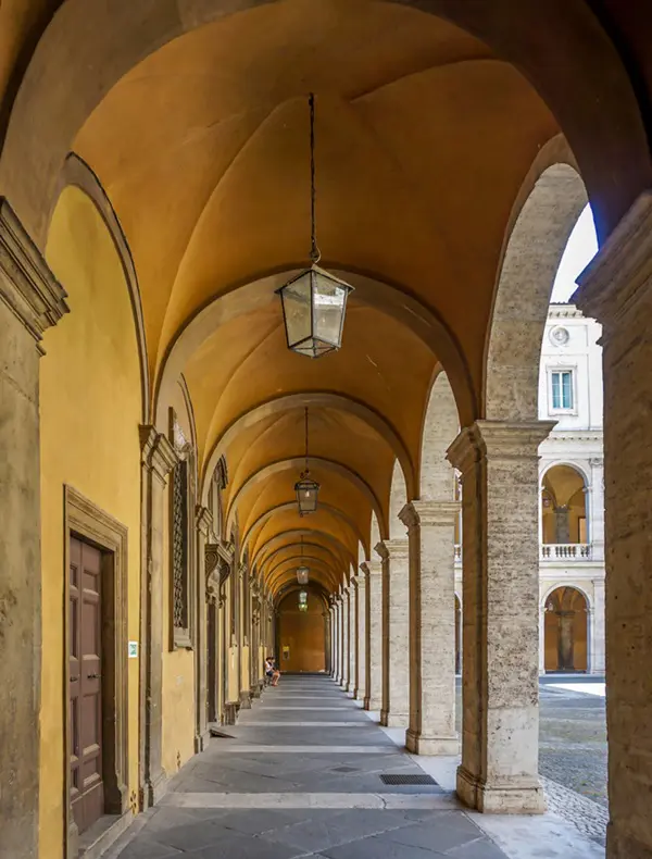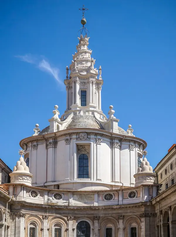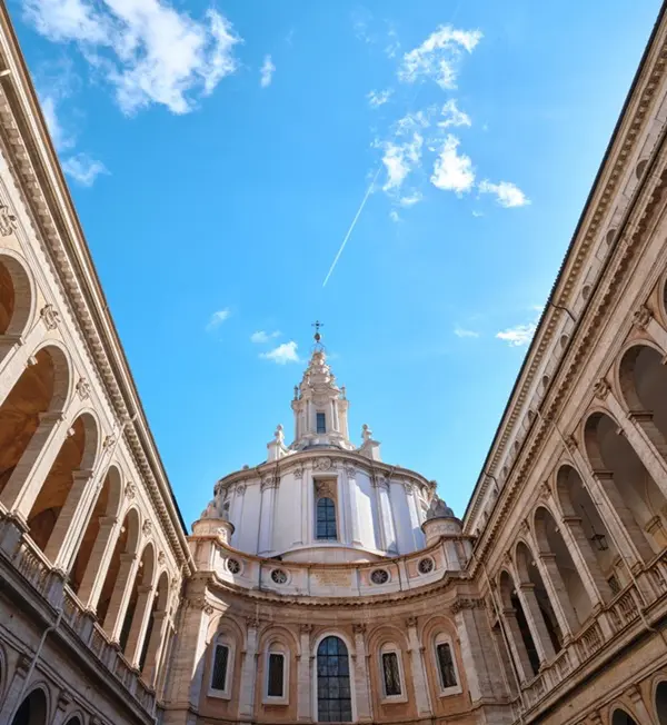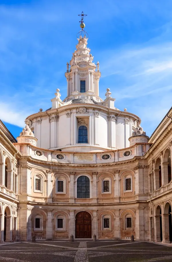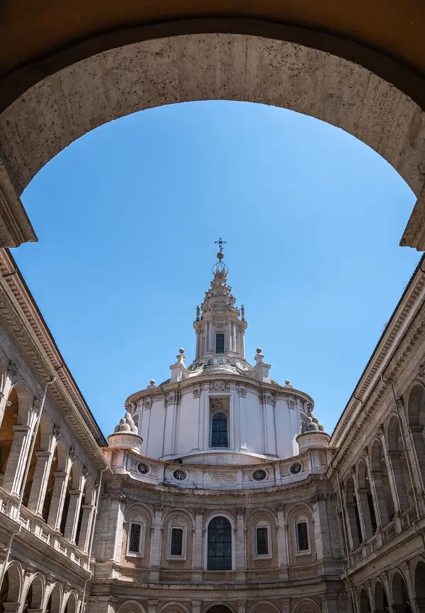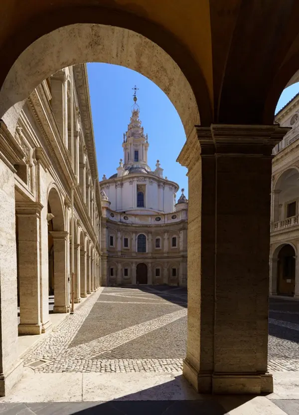 Als je Borromini’s werk beter wil bekijken, kun je de binnenplaats van het Palazzo della Sapienza op wandelen. De kerk prijkt aan het ‘hoofd’ van een elegante zuilengalerij, waarin het Archivio di Stato, het staatsarchief huist.
