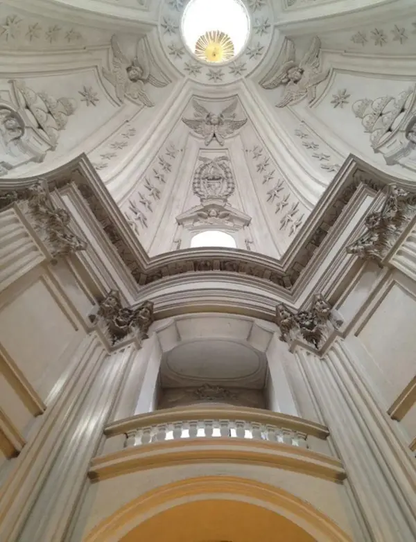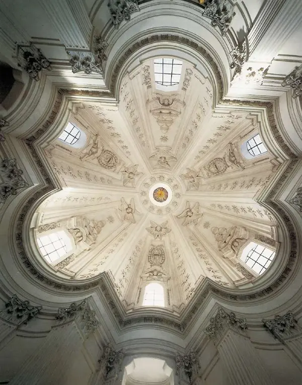 Maar ook de kerk zelf mag er zijn, niet in het minst vanwege de sterk symbolische opzet. De plattegrond is – net als bij de San Carlino – ontstaan uit de kruising van twee gelijkzijdige driehoeken, een patroon dat verwijst naar de zespuntige davidster en daarmee naar de Heilige Drie-eenheid en de wijsheid van koning Salomo.