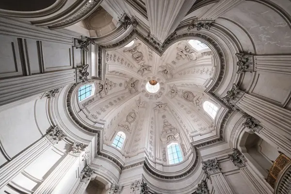 Het interieur van de kerk is grotendeels wit. Daardoor wordt je blik als vanzelf omhoog geleid, naar het gewelf dat bijna vloeiend lijkt, ook met dank aan het licht dat door de ramen en de openingen in de lantaarn naar binnen schijnt.