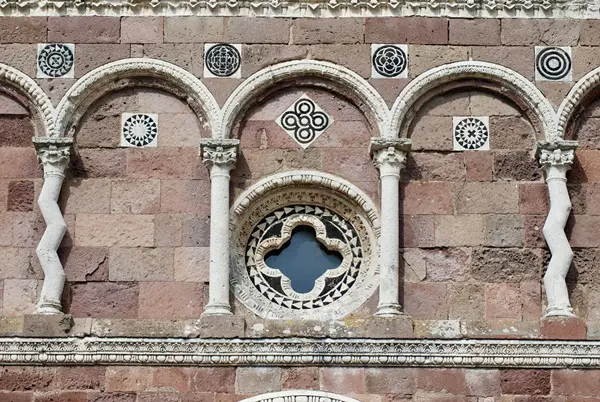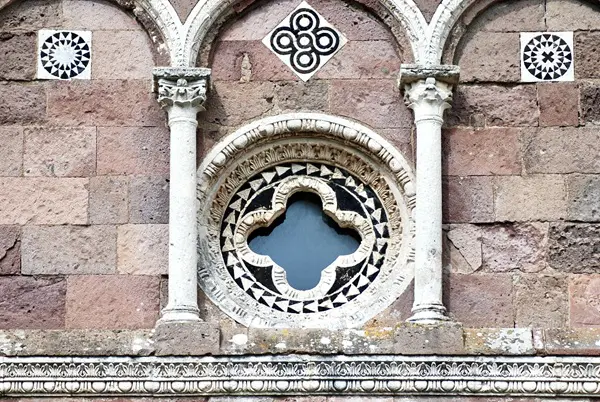 De Nostra Signora is opgetrokken met roodachtig trachiet, een vulkanisch gesteente, en heeft alleen hierdoor al een aparte uitstraling in het omringende groene landschap. Voor de decoraties is gebruik gemaakt van witte zandsteen, die mooi afsteekt tegen het trachiet.