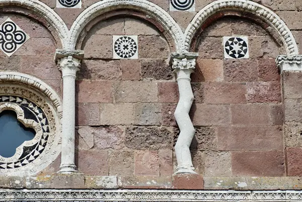 Op het bovenste deel van de voorgevel zie je een blinde loggia met vijf bogen die rusten op vier zuilen, waarvan de buitenste twee in het oog springen door hun merkwaardige zigzagvorm.
