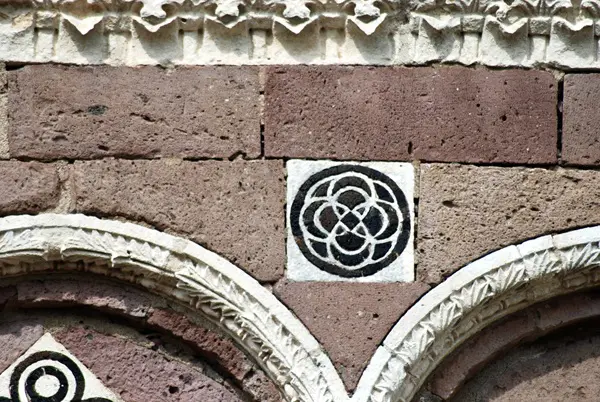 Maar het opvallendst zijn toch wel de rechthoekige decoraties met hun geometrische patronen, die tussen en binnen de bogen zijn aangebracht. En wat vind je van de rozet in het midden? Die mag toch ook best bijzonder heten.