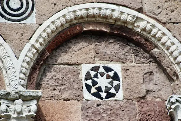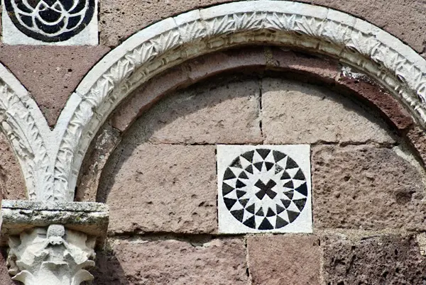 De Nostra Signora is opgetrokken met roodachtig trachiet, een vulkanisch gesteente, en heeft alleen hierdoor al een aparte uitstraling in het omringende groene landschap. Voor de decoraties is gebruik gemaakt van witte zandsteen, die mooi afsteekt tegen het trachiet.
