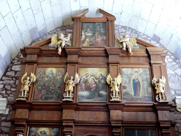 Binnen is de kerk overwegend sober, zoals het hoort in een romaans gebouw. De apsis en het priesterkoor zijn in de zeventiende eeuw getransformeerd naar de smaak van toen en dat is duidelijk te zien. Toch misstaat het niet echt, vind ik.