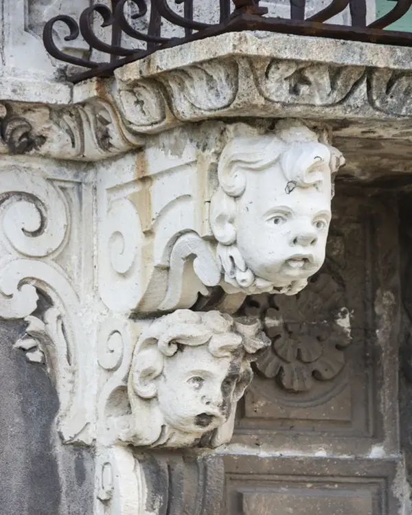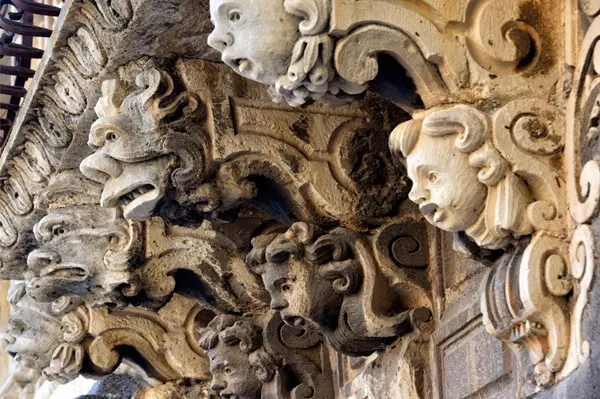 De voorgevel van het klooster is één groot feest van barok, met groteske hoofden en andere fantasievolle decoraties die studenten en schrijvers inspireren.