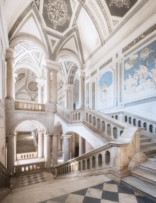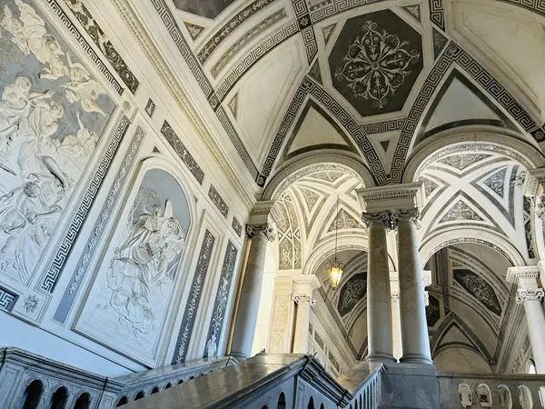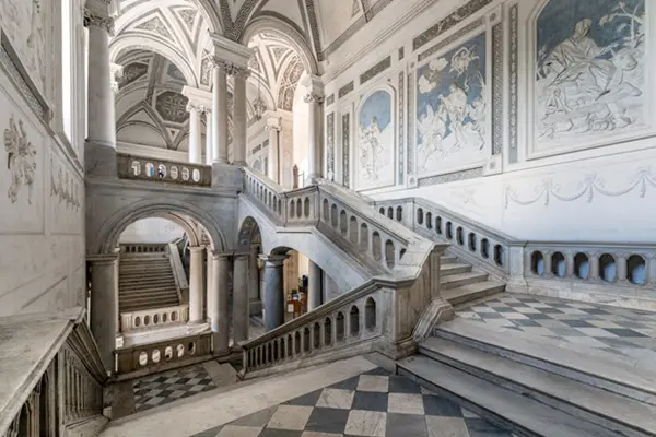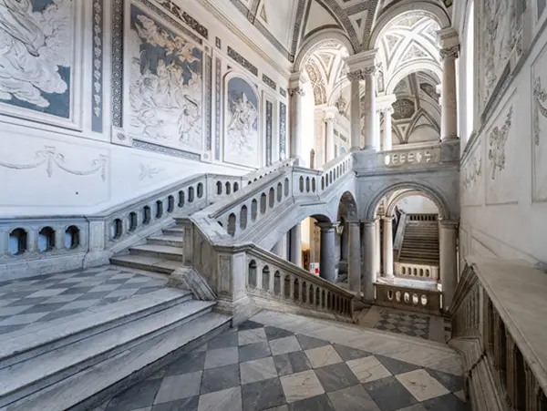 Eenmaal binnen word je meteen overdonderd door de scalone monumentale, de monumentale trappartij, met neoklassiek stucwerk van de hand van Girolamo Palazzotto, die zich hierbij liet inspireren door de trappen in koninklijke paleizen, zoals het Palazzo Reale in Caserta.