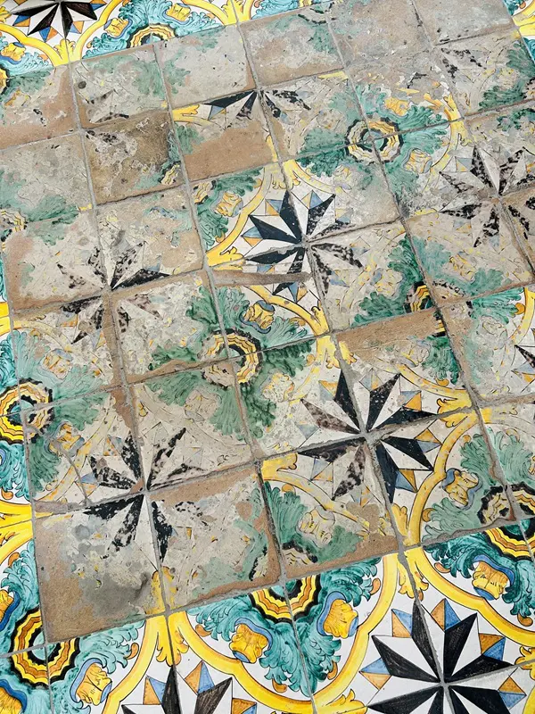 Vanuit de eetzaal stappen we de oude kloosterkeuken binnen, met in het midden een prachtig betegeld kookgedeelte. De majolicategels zijn afkomstig uit Vietri sul Mare, aan de Amalfikust, en vormen prachtige bloemmotieven.