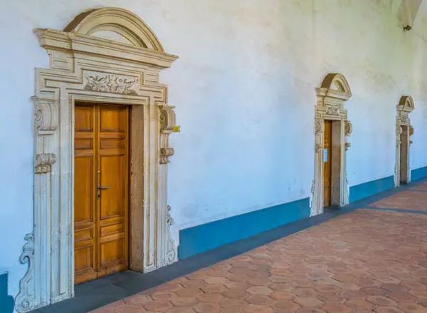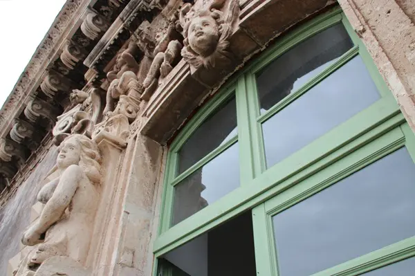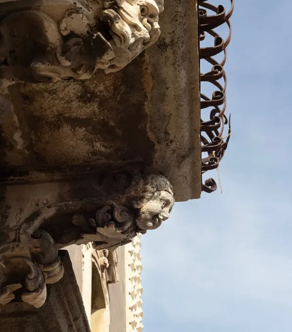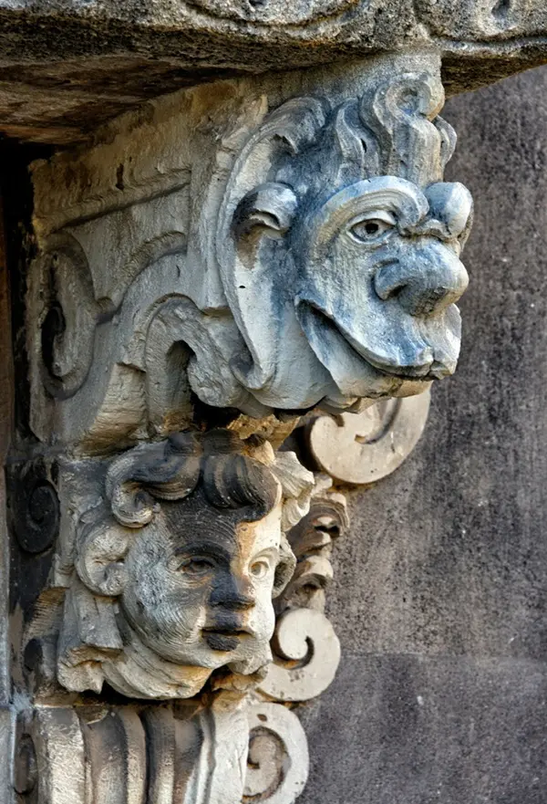 De voorgevel van het klooster is één groot feest van barok, met groteske hoofden en andere fantasievolle decoraties die studenten en schrijvers inspireren.