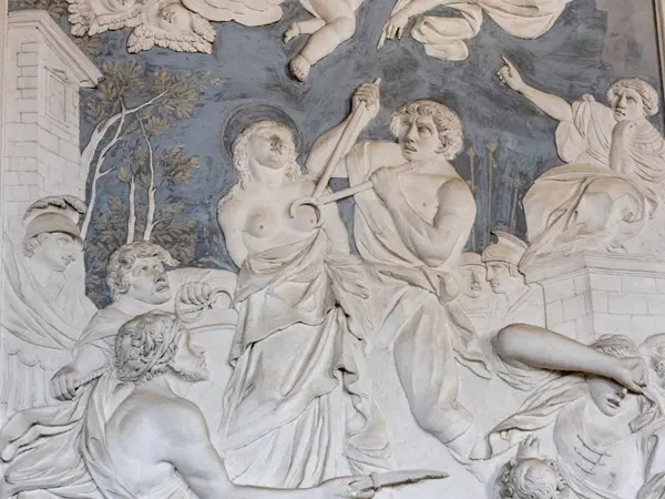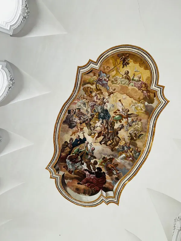 Je ziet onder meer de heilige Benedictus, de stichter van de orde, San Nicolò, Sant’Agata, San Placido en de doop van Christus. Bij de voorstelling van de marteling van de jonge Agatha, die wordt afgebeeld als haar borsten afgesneden worden, zie je aan haar voeten een hondje, als symbool voor extreme trouw aan God. De scènes worden omlijst door slingers, kransen, engelen, bloemen en geometrische motieven.