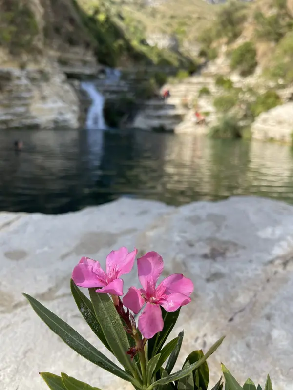 Langs de zonnige oevers van de Cassibile staan felroze oleanders, die extra opvallen op een plek waar groen en wit de enige kleuren lijken. Een zeldzaam mooie plek om een verfrissende duik te nemen. Het water is ijskoud, maar zwemmen midden in dit natuurlijke spektakel, in water dat alle tinten groen en turquoise weerspiegelt, is een unieke ervaring.’