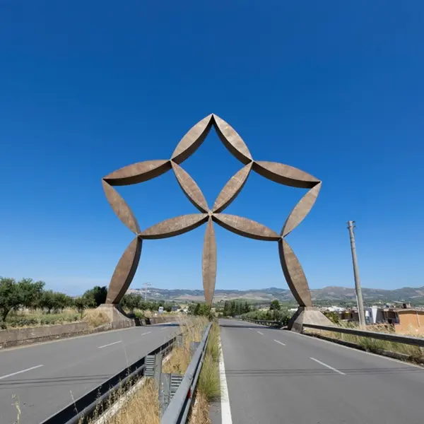 Als je van Burri’s Grande Cretto naar Nuova Gibellina rijdt, ruim tien kilometer verderop, word je verwelkomd door de Stella di Belice (1980) van de hand van Pietro Consagra.