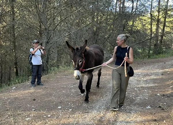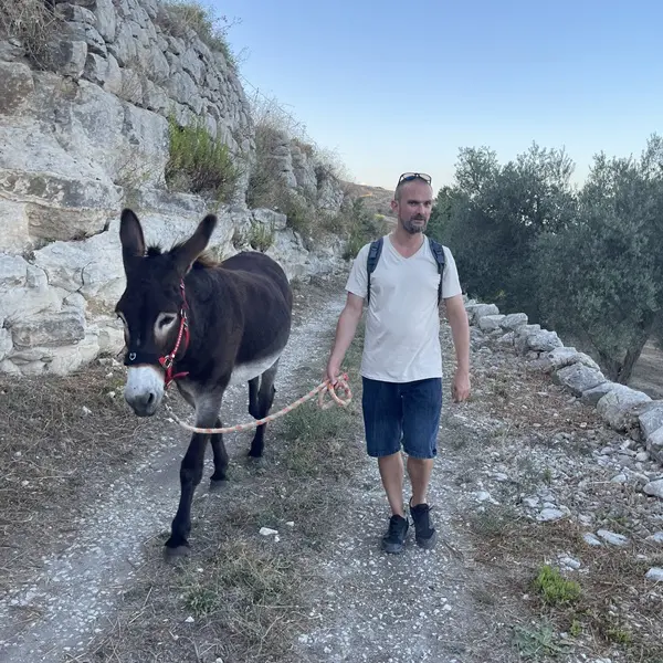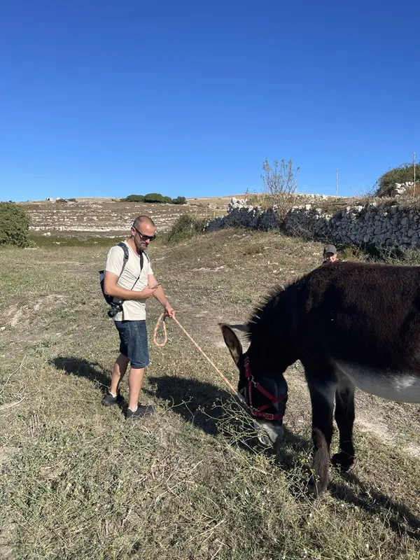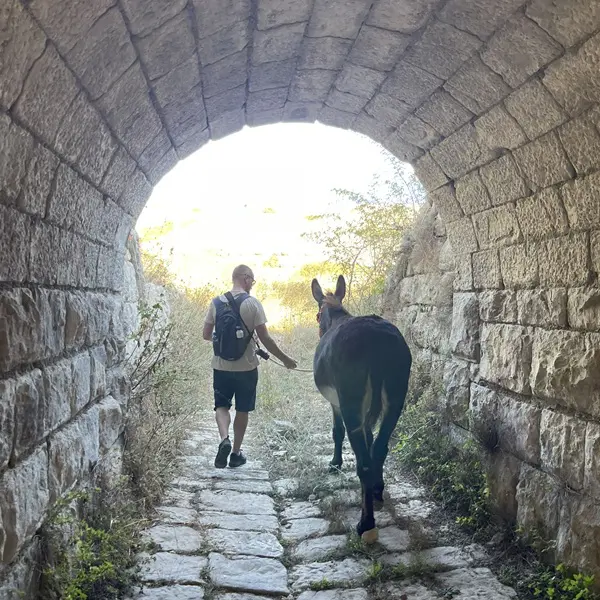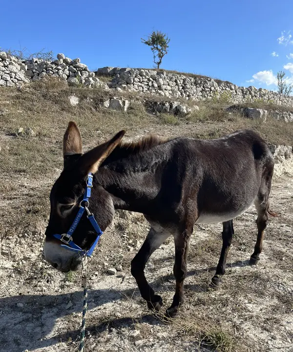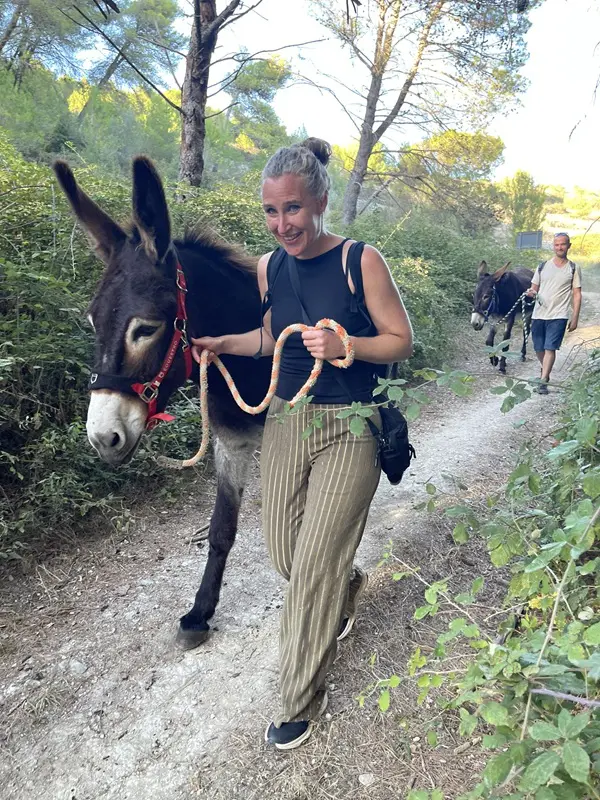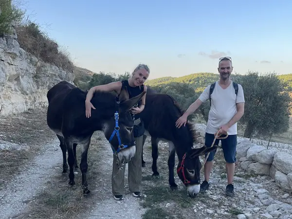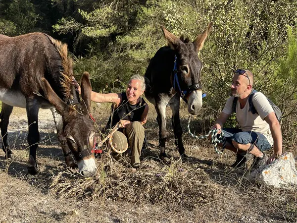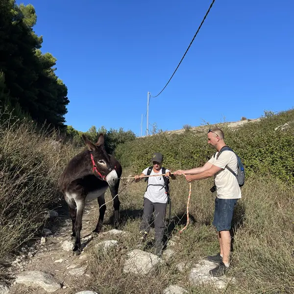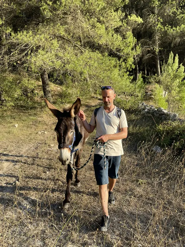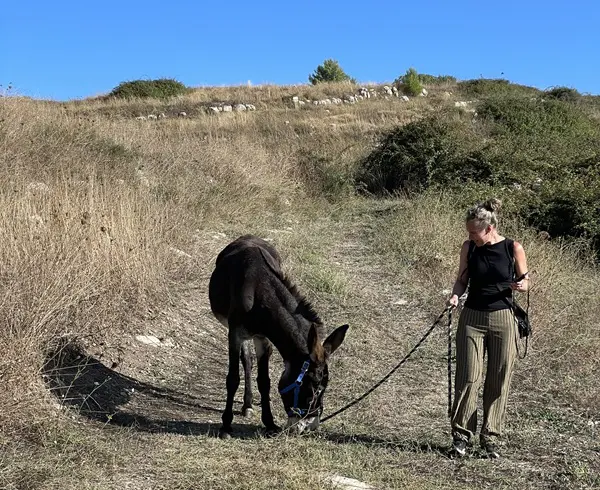 We lopen stilletjes door de velden, in een landschap vol kalkstenen muurtjes, ver weg van de bewoonde wereld. Je hoort alleen het geritsel van dor gras onder de hoeven van de ezels en je schoenen.
