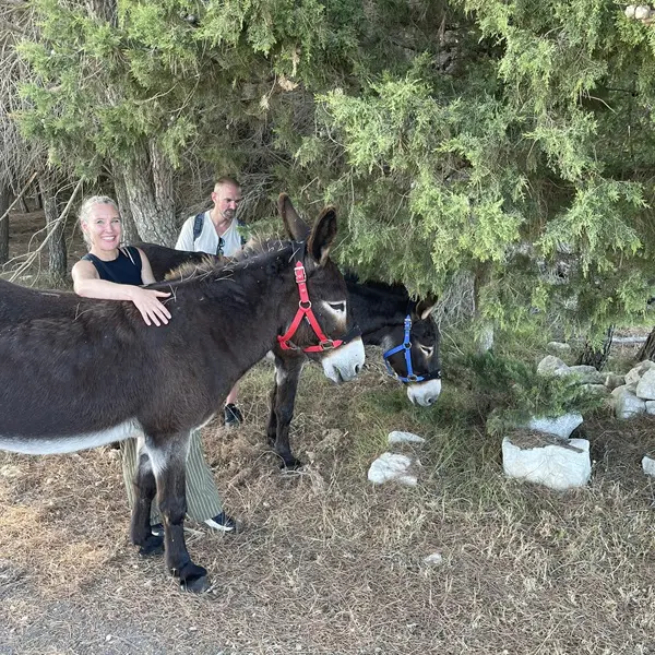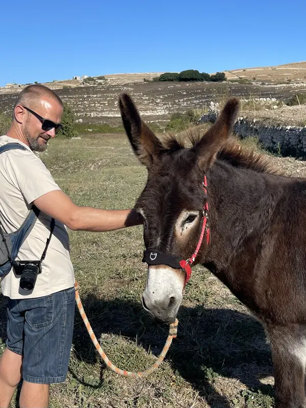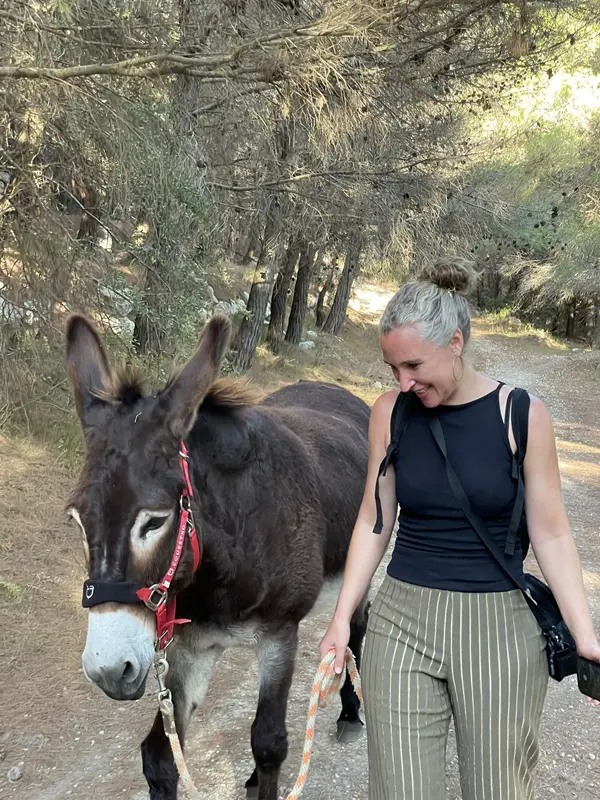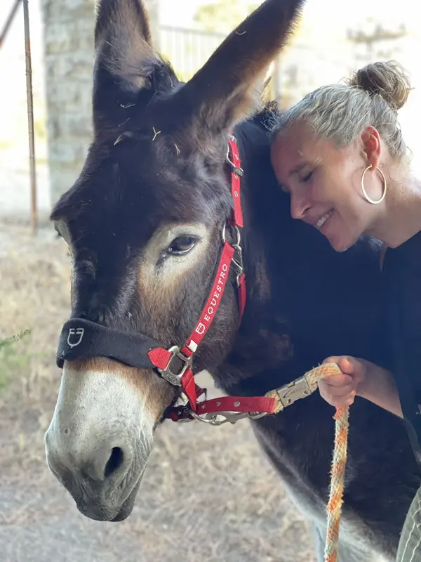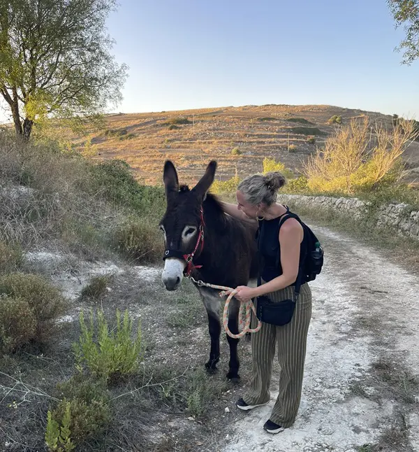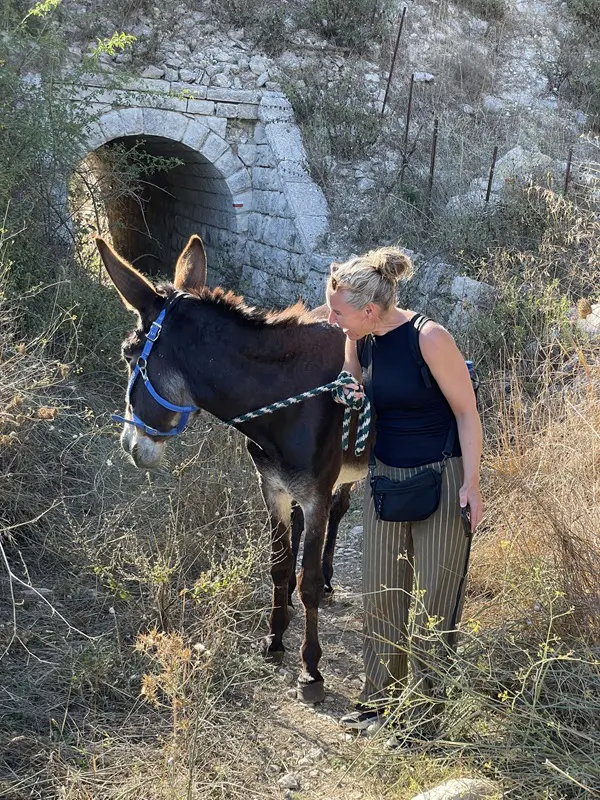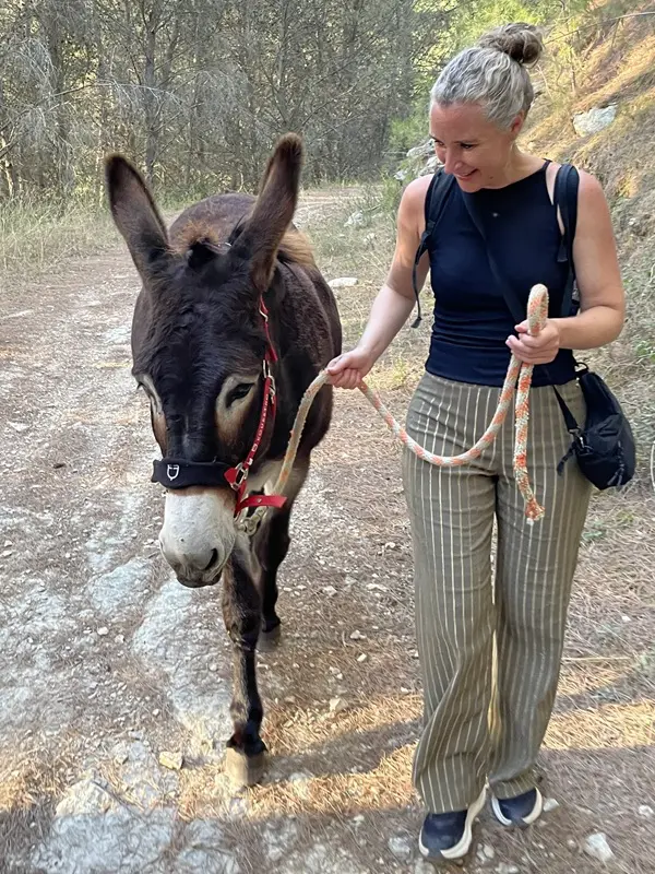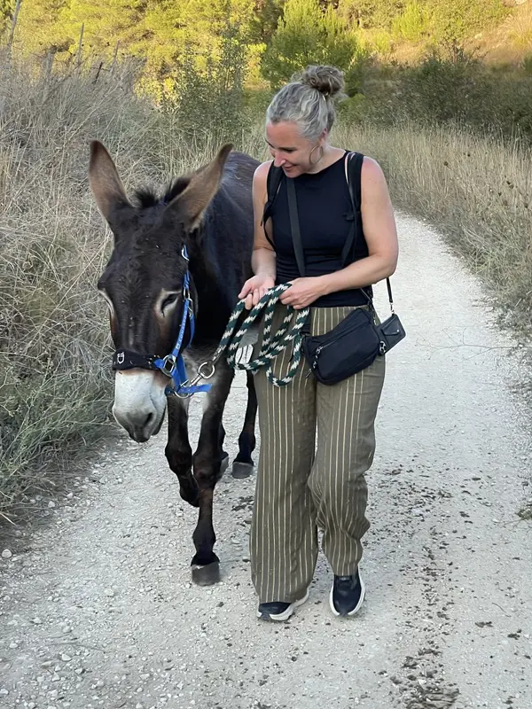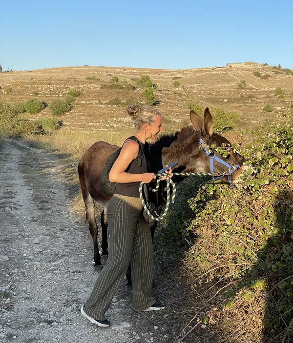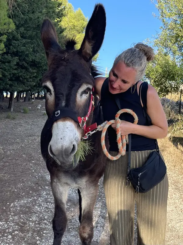 Annerike: ‘Het is een half uurtje rijden vanuit Ragusa, waar we logeren. Anna staat ons al op te wachten als we het erf oprijden. Ze neemt ons mee naar een weiland achter de boerderij, waar vier lange nieuwsgierige ezelsoren onze kant op bewegen als we aan komen lopen.