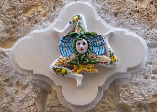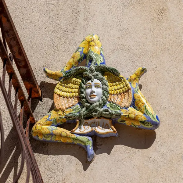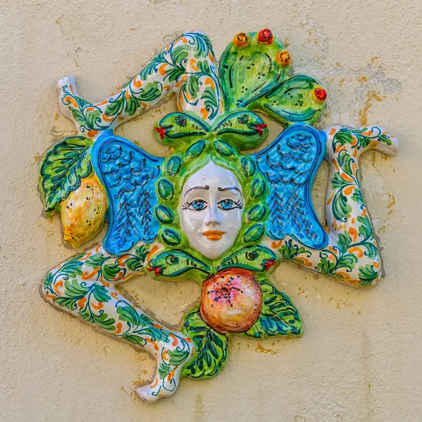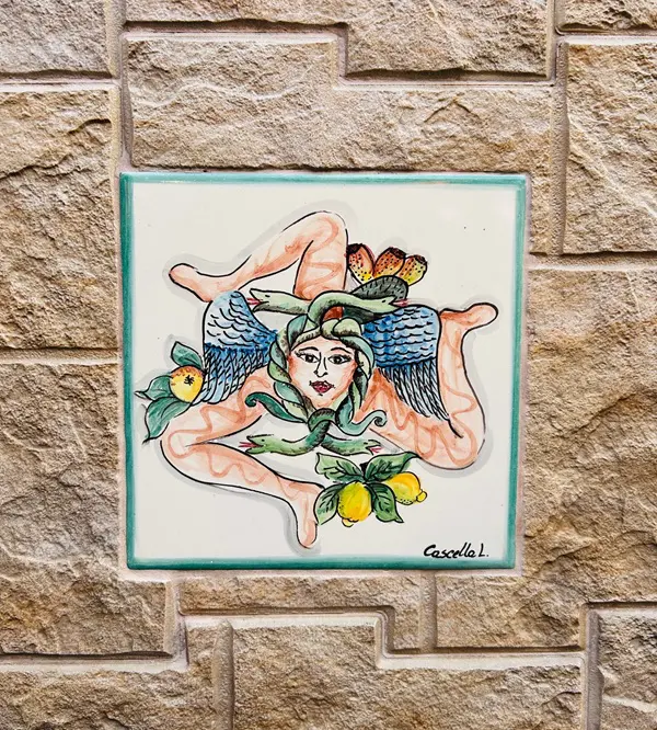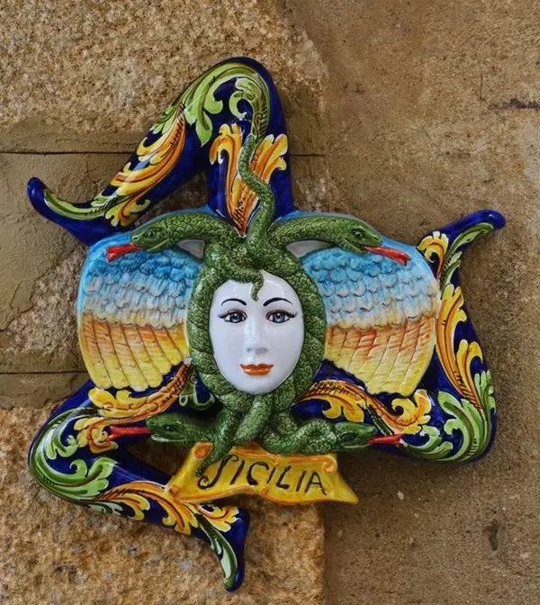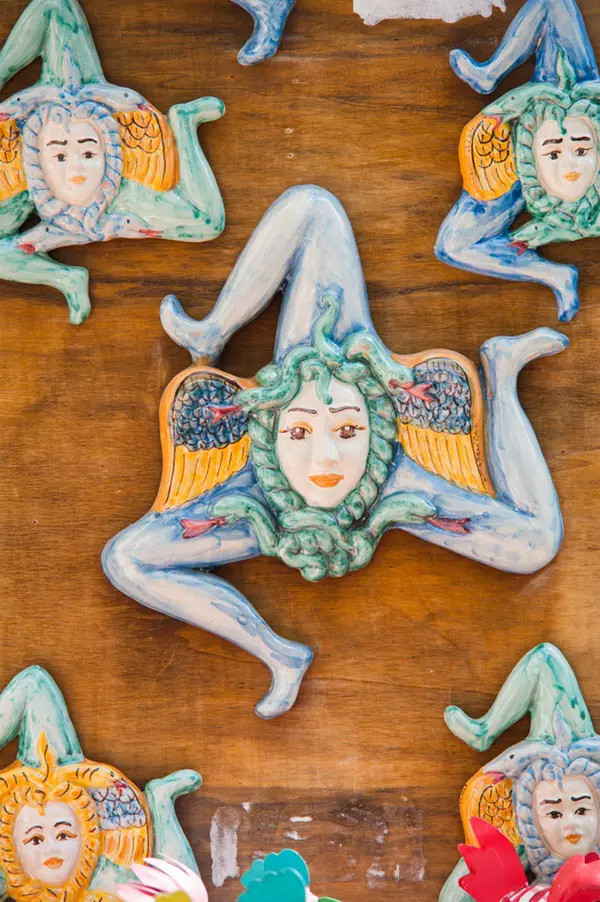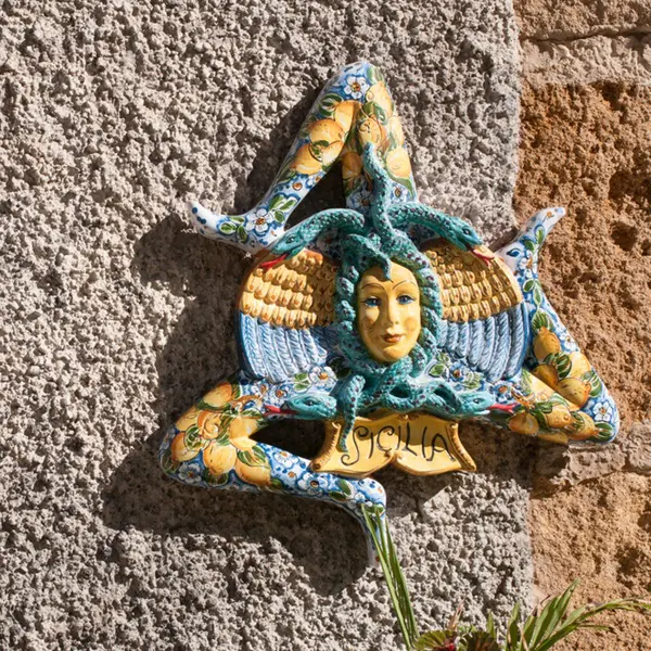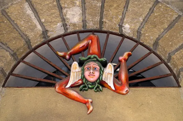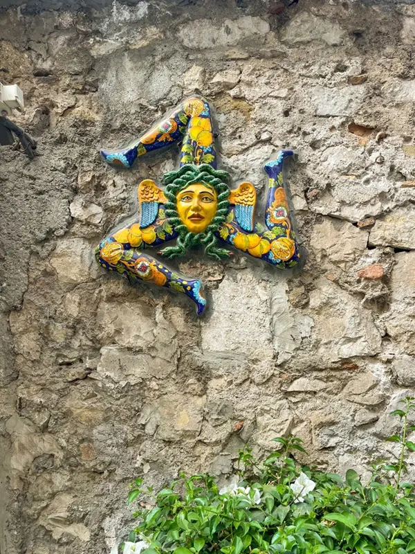 Saskia: ‘Meteen nadat je aankomt in Catania, maak je kennis met een van de symbolen van Sicilië: de trinacria, een mysterieus mythologisch symbool dat onder andere op de vlag van Sicilië wappert. De trinacria bestaat uit een driebenig monster, de zogenaamde gorgo. Het hoofd van het monster wordt gesierd door twee vleugels en omringd door slangen.
