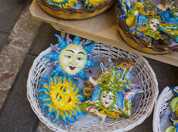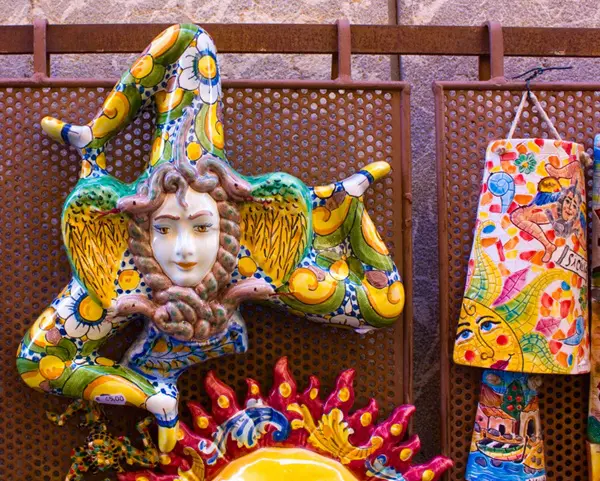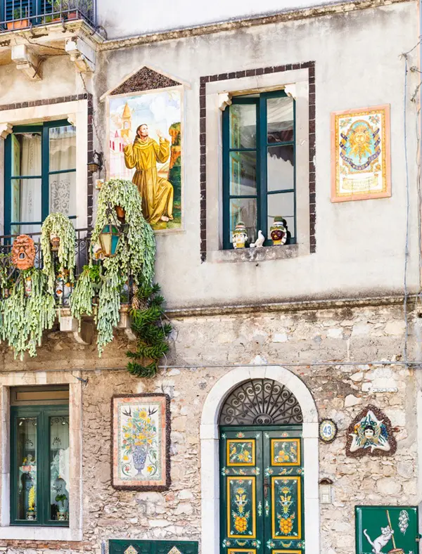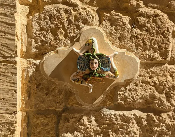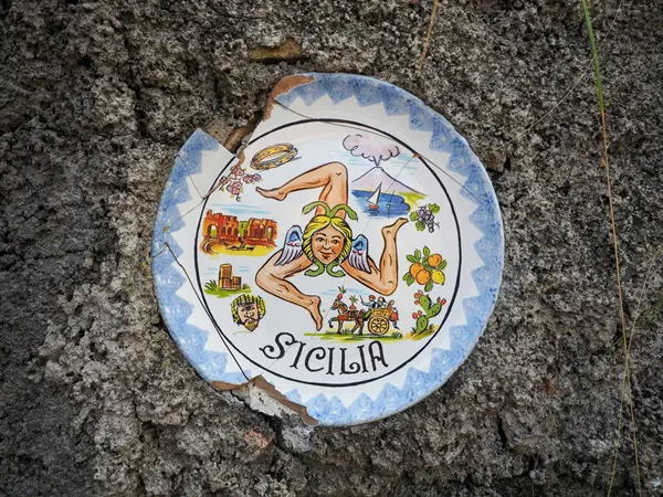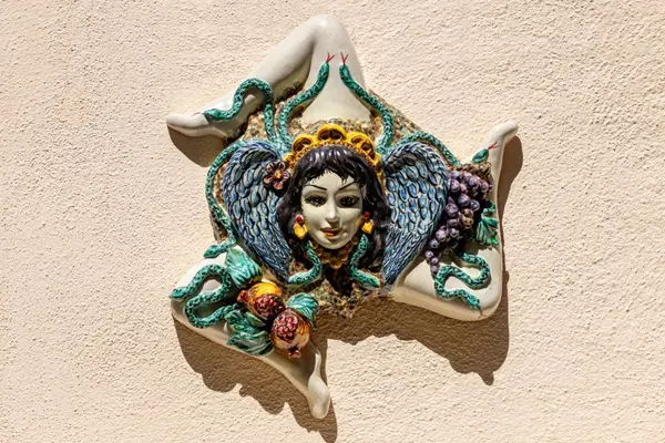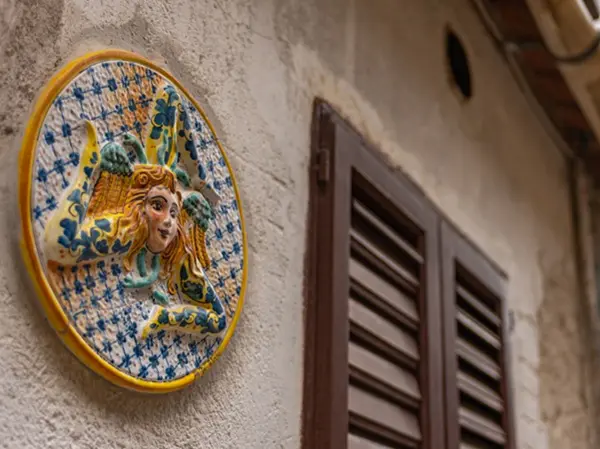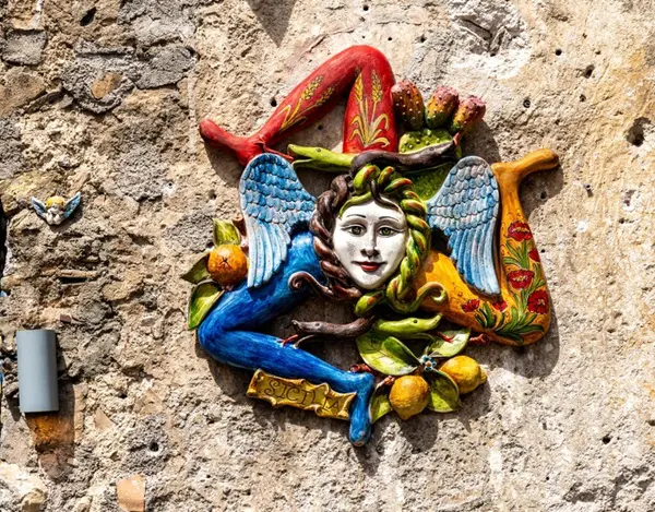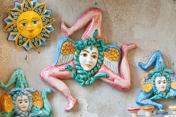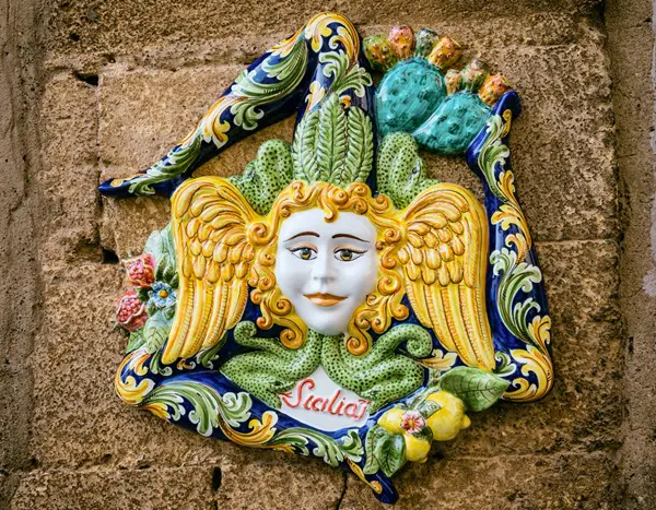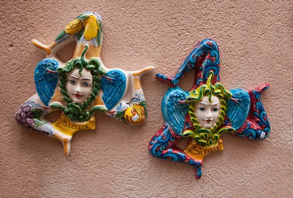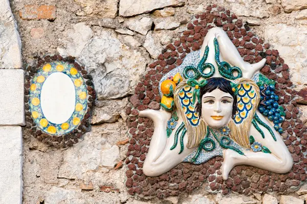 Saskia: ‘Meteen nadat je aankomt in Catania, maak je kennis met een van de symbolen van Sicilië: de trinacria, een mysterieus mythologisch symbool dat onder andere op de vlag van Sicilië wappert. De trinacria bestaat uit een driebenig monster, de zogenaamde gorgo. Het hoofd van het monster wordt gesierd door twee vleugels en omringd door slangen.