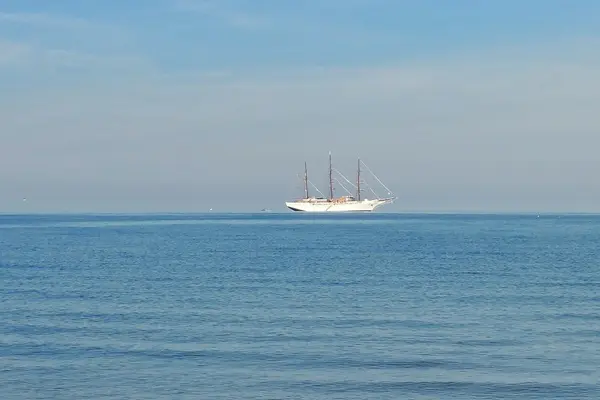 Alleen… van de Palinuro nog geen spoor. We voegden ons bij het groepje wachtenden, die net als wij nieuwsgierig om zich heen keken. Tot iemand plots wees: ‘Kijk, daar ligt het schip!’ En inderdaad, de Palinuro lag niet voor anker in de haven, maar op volle zee, glinsterend in het zonlicht. We vroegen ons af hoelang het zou duren voor het schip de haven binnen zou varen.