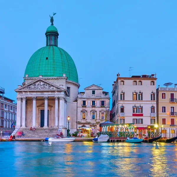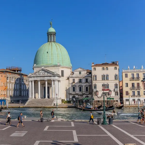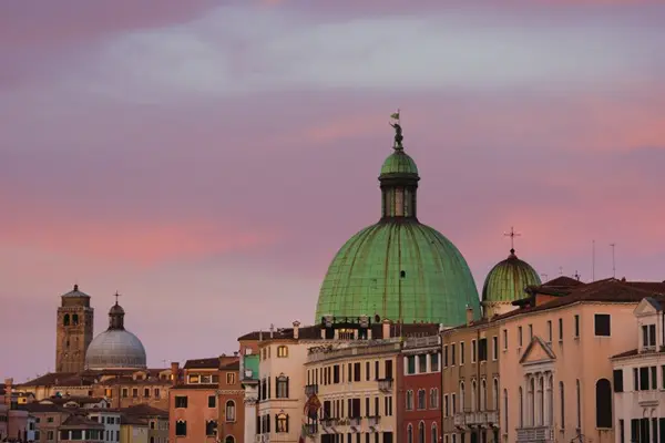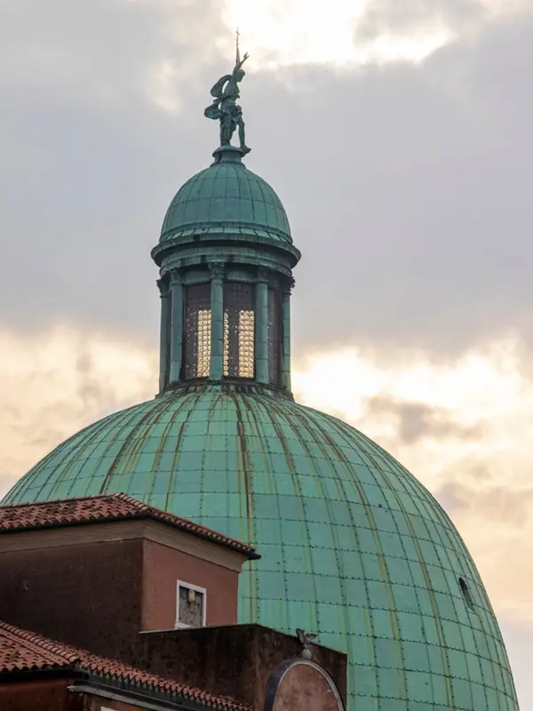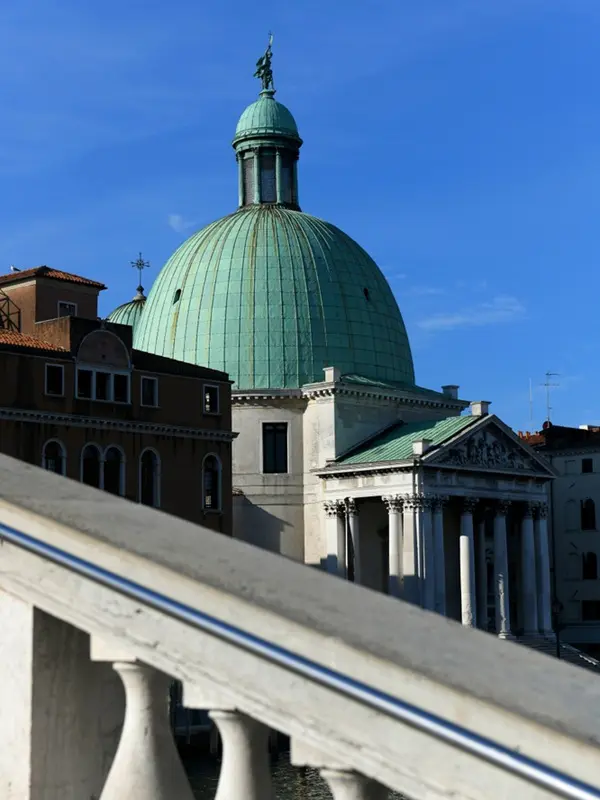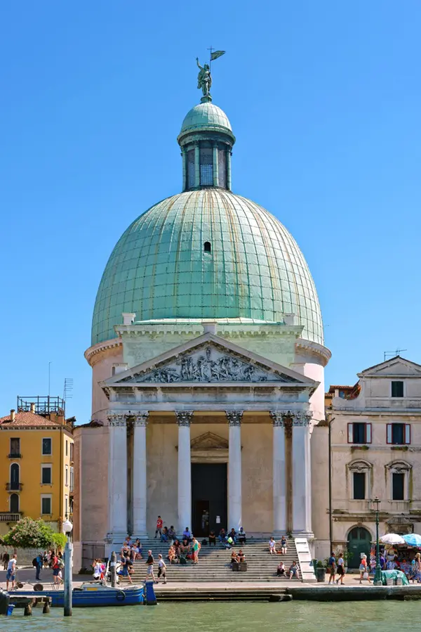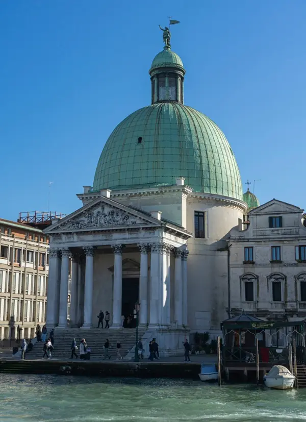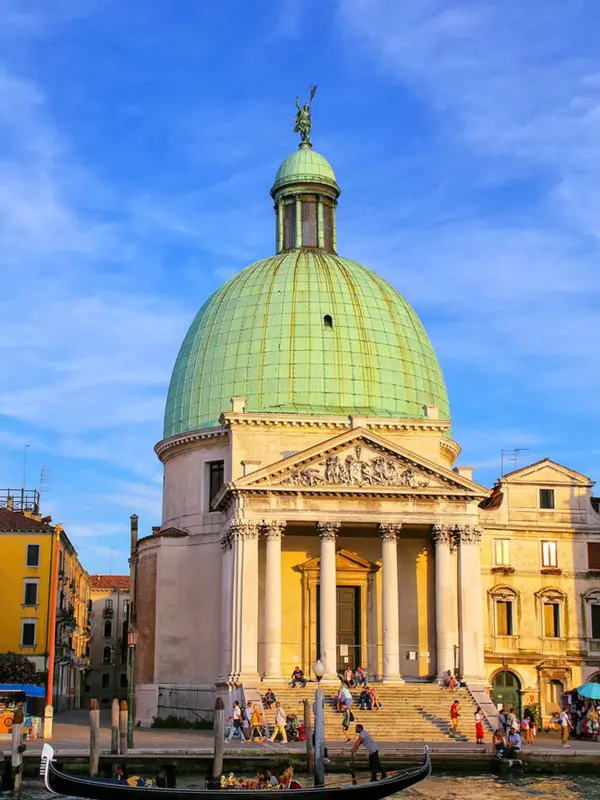 Als je het station van Venetië uitkomt, zie je aan de overkant van het Canal Grande een van de opvallendste kerken van de stad: de San Simeon Piccolo, met een majestueuze koepel die dankzij de koperen bekleding vaak prachtig het zonlicht vangt.