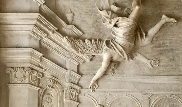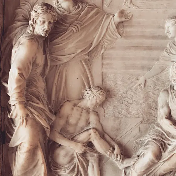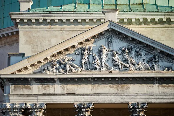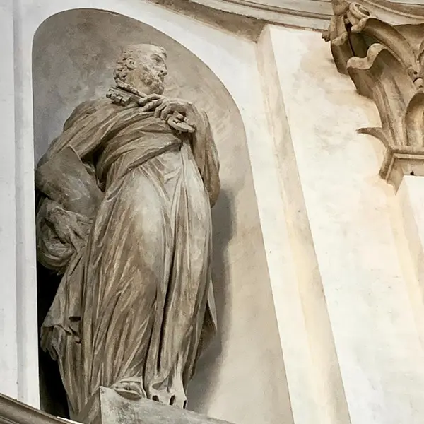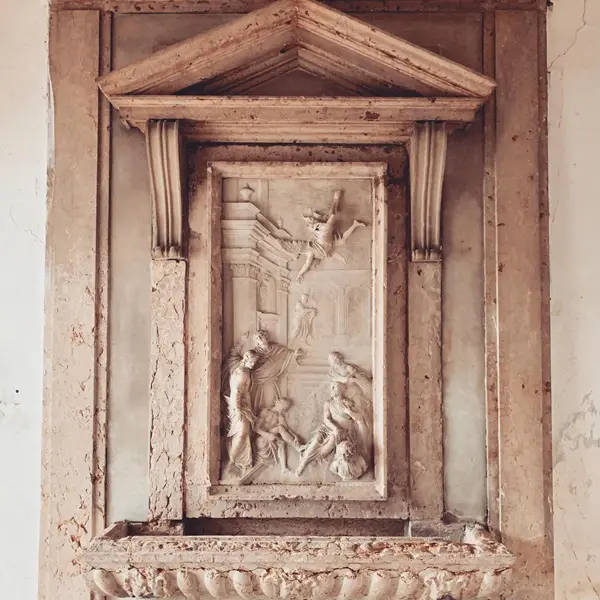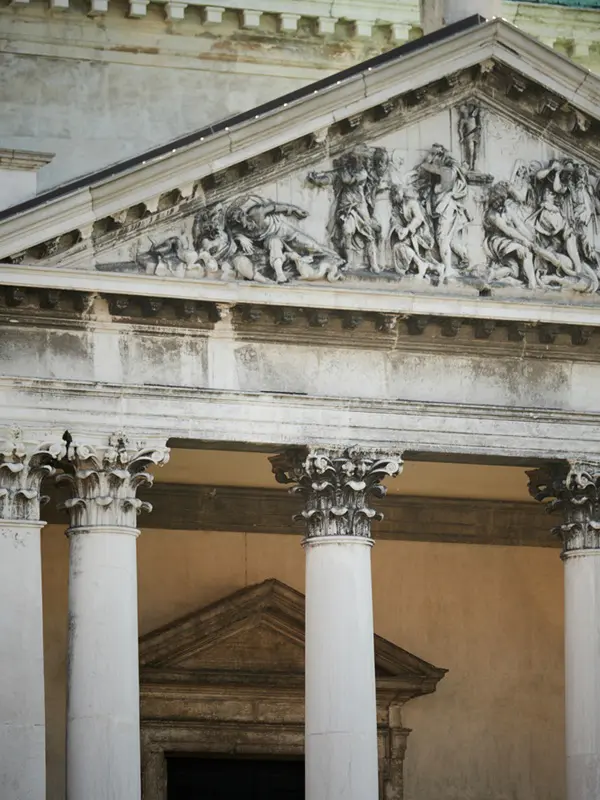 In het driehoekige timpaan van het portaal bewonder je het prachtige marmeren reliëf van Francesco Penso, alias Cabianca, dat het martelaarschap van de heiligen Simon en Judas uitbeeldt. Het is zo indrukwekkend dat het moeiteloos kan wedijveren met de grote beeldhouwwerken die de Griekse tempels sierden.