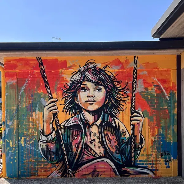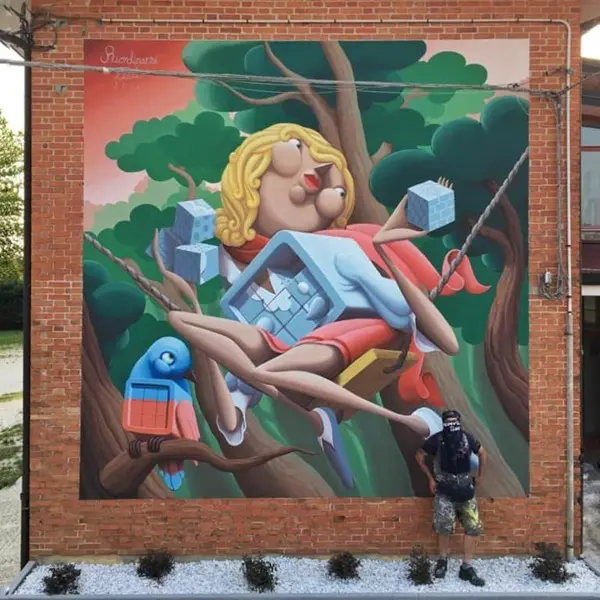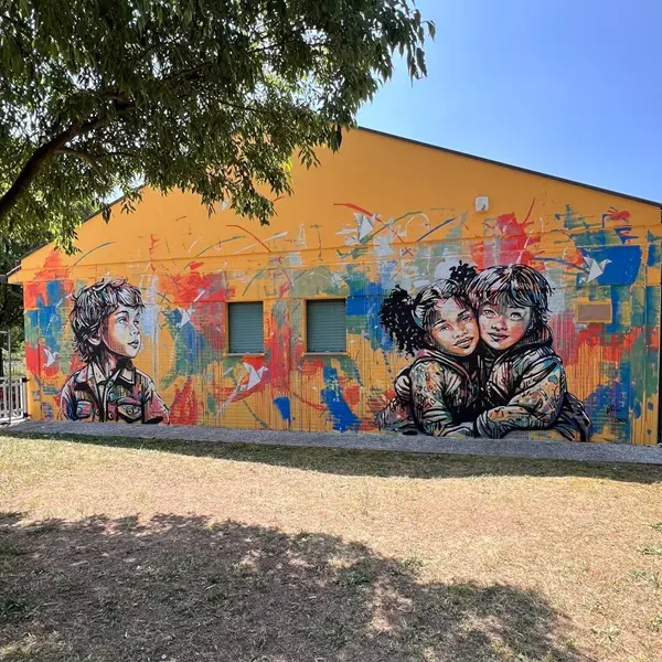 Ze is een van onze favoriete street artists: Alice Pasquini, van wie we onder meer in Rome en Civitacampomarano mooi werk zagen. In Vallà beschilderde ze de muren van de kleuterschool, aan de Via Capitello, waarbij ze zich liet inspireren door de kindertijd als bron van creativiteit en groei.